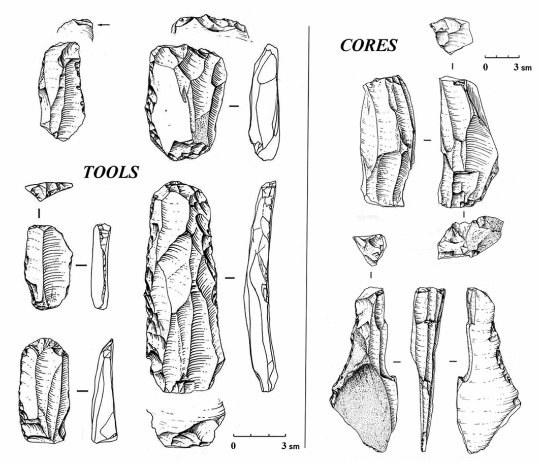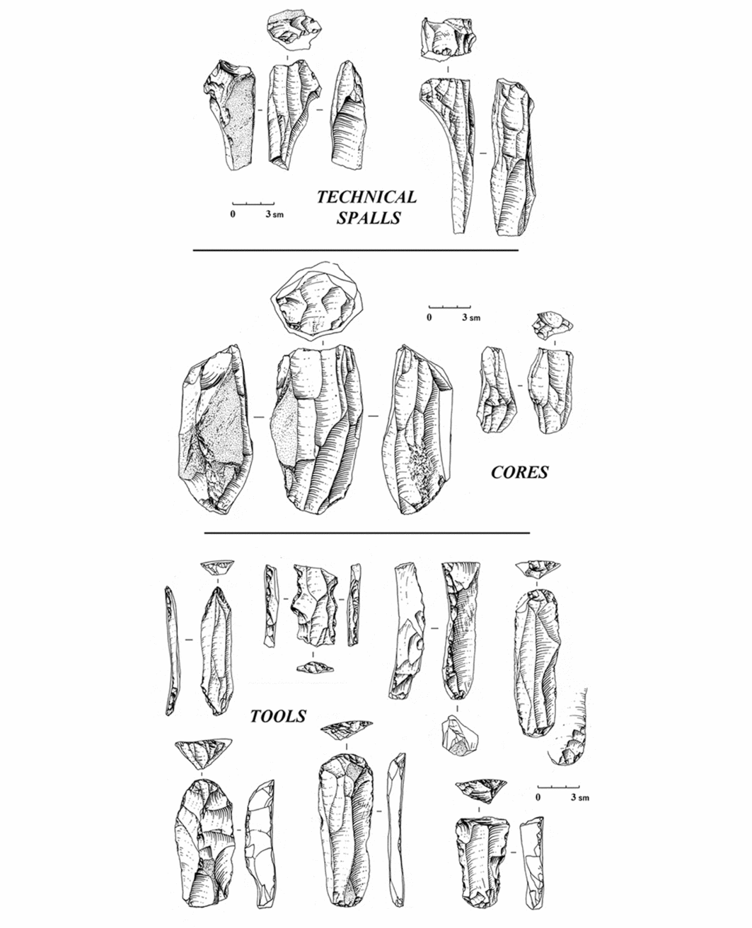 The presence of several specific object types from within the lower assemblage (e.g. burin-cores, end scrapers with ventral base thinning of the blank, truncated blades, a tanged point) makes it possible to attribute the site to the initial stages of the Upper Palaeolithic (45–35 kyr BP). Another indication is the predominance of blades among the flakes, including large blades of up to 0.2m in length, and the use of specific methods for overhang reduction (pecking).