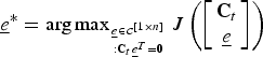 2. 2. Find $\underline{e}^{\ast} = \mathop{\arg \max}\nolimits_{{\underline{e} \in {\cal C}^{\lsqb 1 \times n\rsqb }}\atop{\colon {\bf C}_{t} \underline{e}^{T} = {\bf 0}}} J\left(\left[\matrix{{\bf C}_{t} \cr \underline{e}} \right]\right)$ .