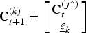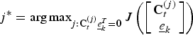 3. 3. Find $j^{\ast} = \mathop{\arg \max}\nolimits_{j \colon {\bf C}_{t}^{\lpar j\rpar }\underline{e}_{k}^{T} = {\bf 0}} J\left(\left[\matrix{{\bf C}_{t}^{\lpar j\rpar } \cr \underline{e}_{k}} \right]\right)$ .