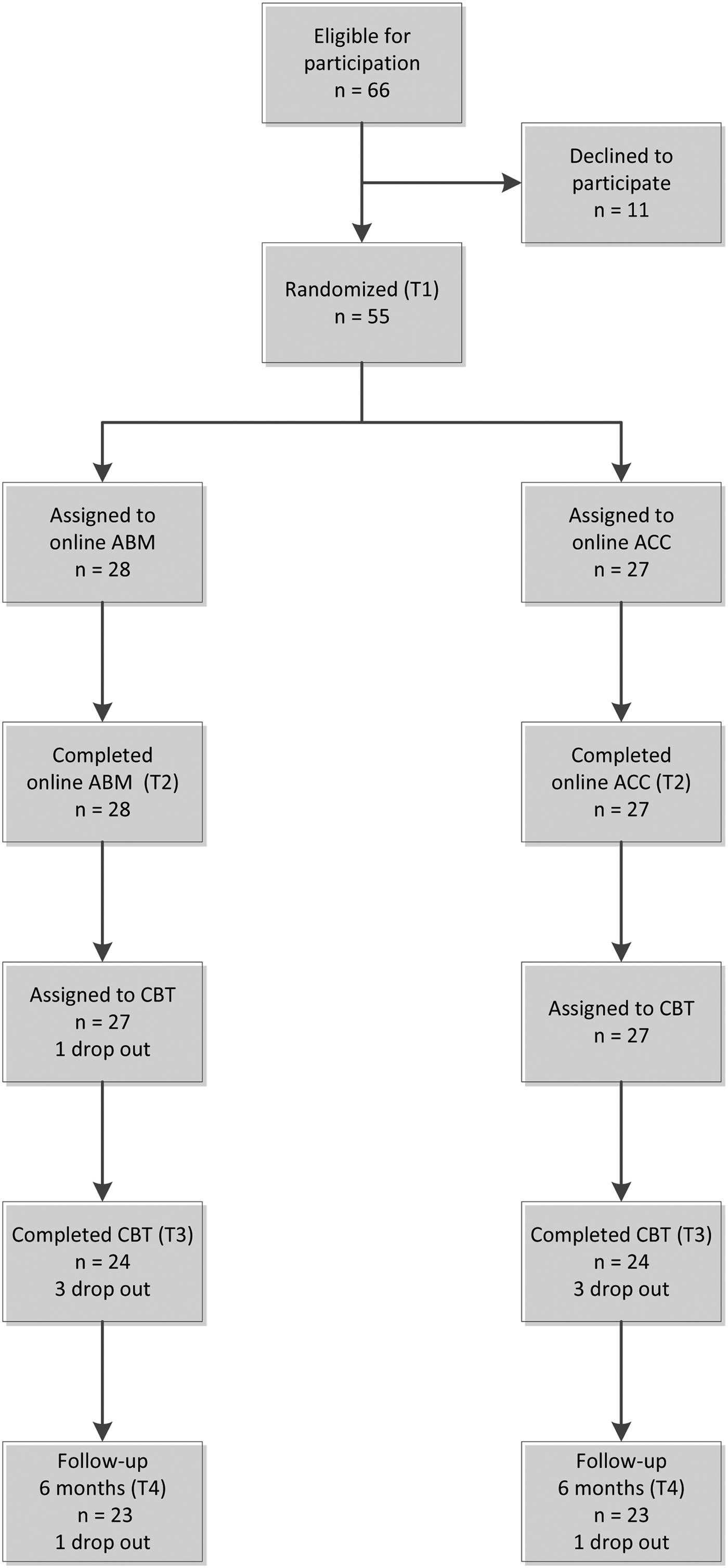 Figure 1. Flow of participants. Note: One participant from the ABM group needed more intensive treatment because of school-refusal and was not assigned to CBT. During CBT, six participants dropped out of the study equally divided over the ABM and ACC group (T3, total n = 48). Reasons for drop-out were unwillingness to continue CBT (n = 3) and worsening of symptoms (n = 3). At follow-up, 46 children participated with one drop-out (due to the perceived burden of the assessment) in each condition.