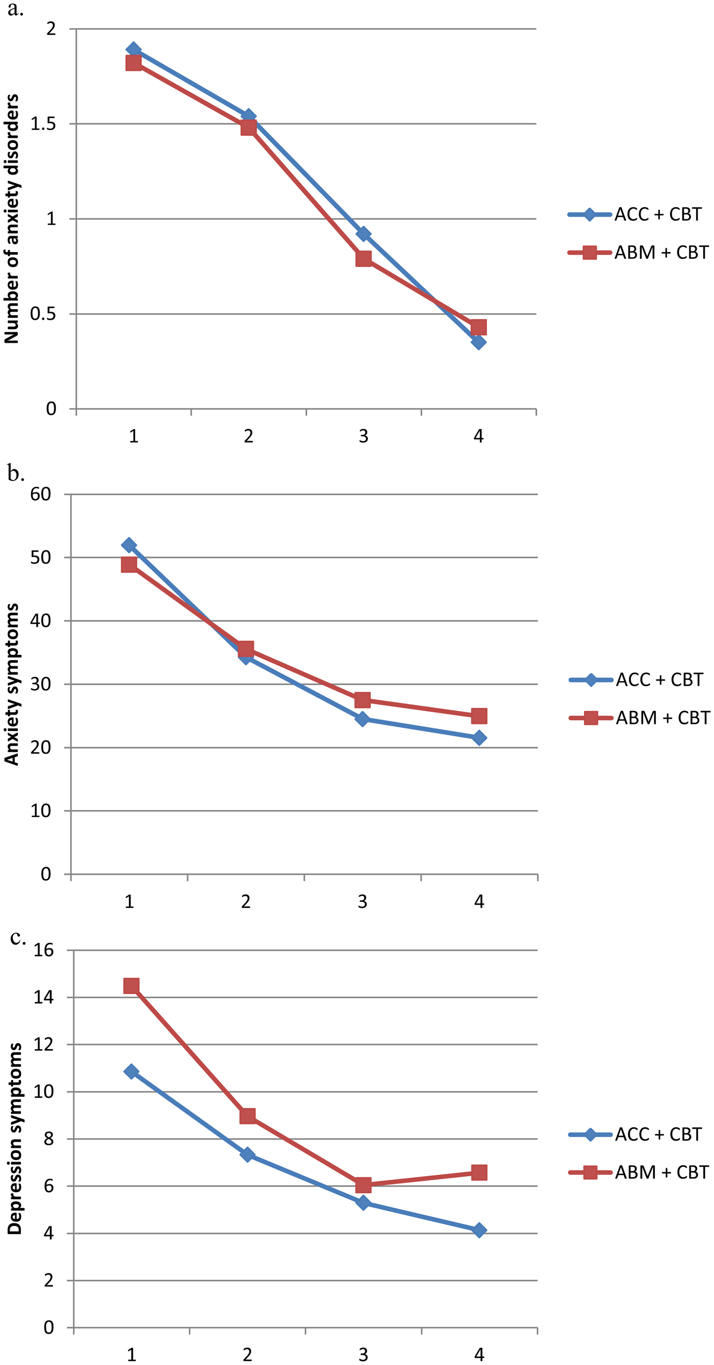 Changes in AB from T1 to T3 were not significant across time (Wald = 1.06, b = −0.77, SE = 0.66, p = .24), and no interaction effect between group and time or main effect of group was found. From T3 to T4, a main effect of group (Wald = 4.62, b = 39.58, SE = 18.41, p = .032) and an interaction effect between group and time was found for changes in AB (Wald = 3.87, b = −1.76, SE = 0.90, p = .049). Although the direction of AB change from T3 to T4 was different across groups, AB at both assessments for the ABM + CBT group and ACC + CBT group were not significantly different from zero (Table 2).