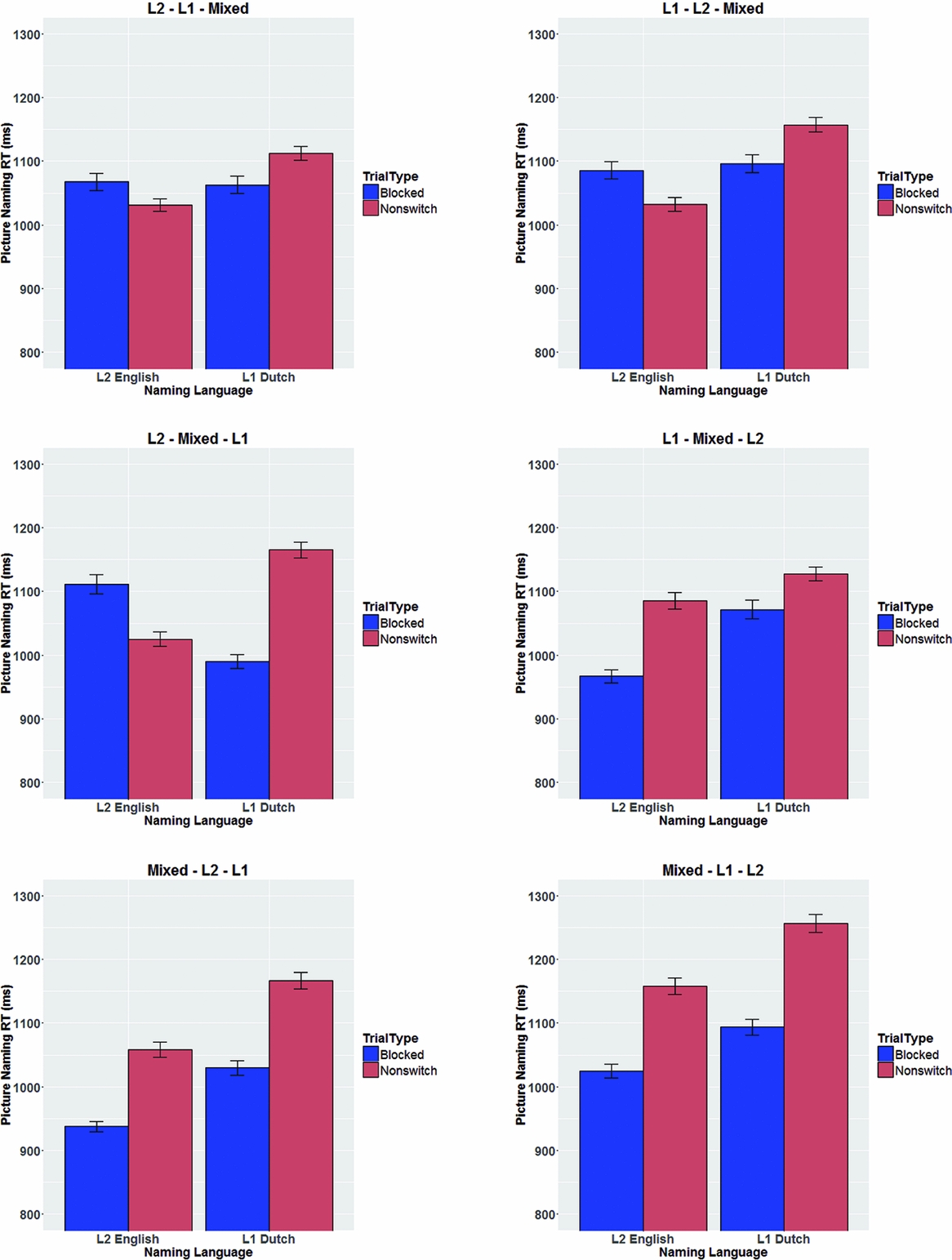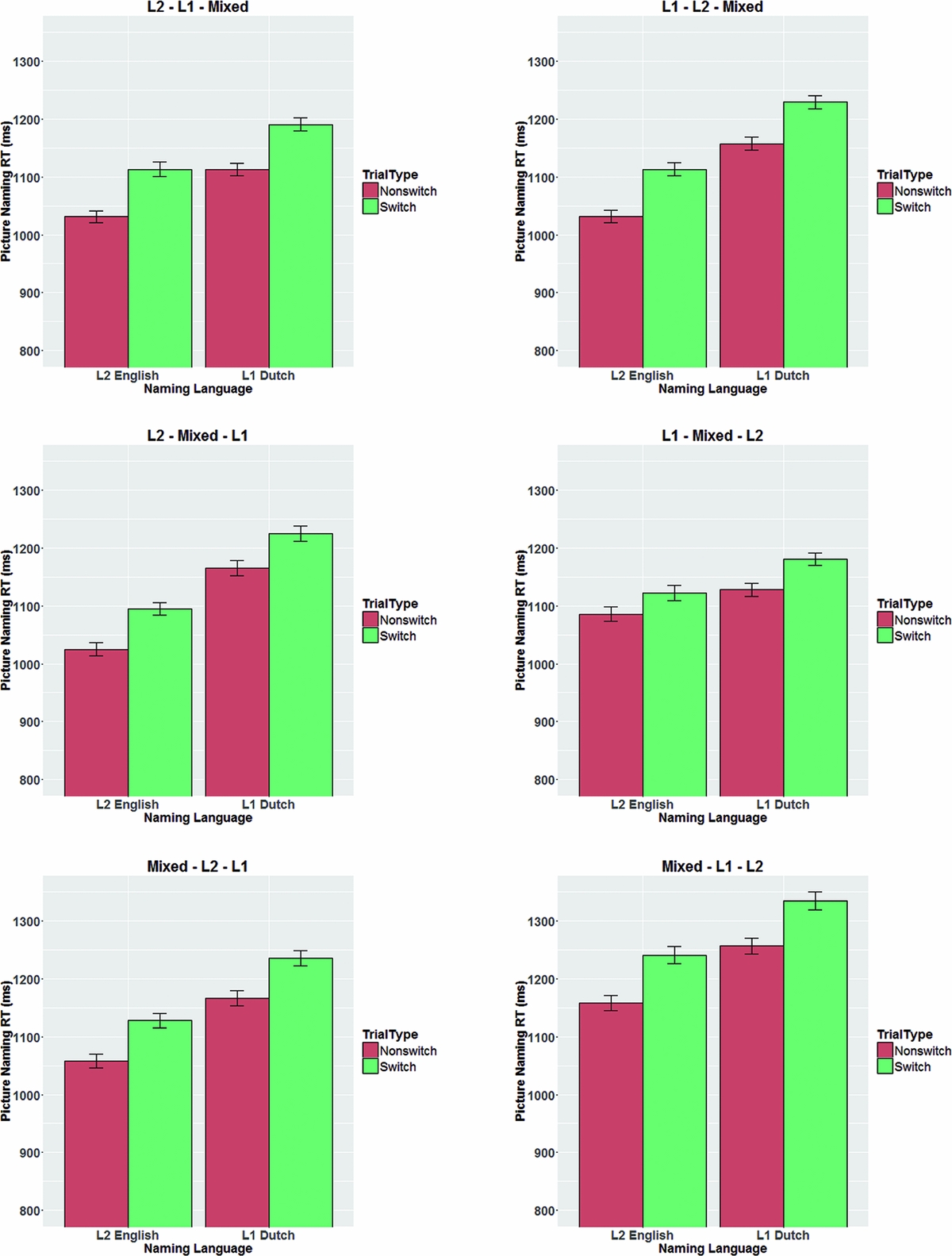 A different pattern emerged for the mixing costs (see Figure 10). The analyses showed a significant interaction between NamingLanguage, TrialType, and Order (Table 8). Follow-up analyses on the 6 orders separately revealed significant interactions between NamingLanguage and TrialType for the 3 orders in which the L2-block preceded the mixed block, but no such interaction for the 3 orders in which the mixed block preceded the L2-block. Hence, as can be seen in Figure 10, participants had shorter RTs in L2 in the block that came later in the experiment, which reflects repetition priming for L2. For L1 there was no such repetition priming effect, as participants in all 6 orders were faster in the L1-block compared to the L1 non-switch trials (see Table 9).