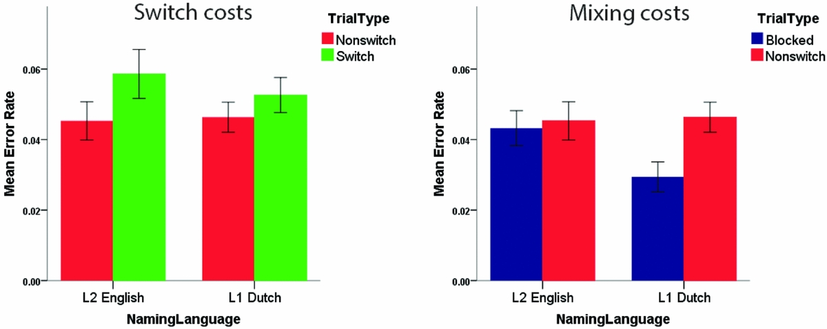 A repeated measures ANOVA on the error rate data with factors TrialType, NamingLanguage, and Experiment revealed a significant main effect of TrialType, F (1,92) = 10.66, p = .002. This effect reflected that across the four Experiments, switch trials (M = .056) yielded more errors than non-switch trials (M = .046). No other significant main or interaction effects were observed in this analysis (all p's > .19). A similar analysis testing for mixing costs observed a significant interaction effect between TrialType and NamingLanguage, F (1,92) = 4.45, p = .038. No three-way interaction between these two factors and Experiment was observed (p = .573). Follow-up analyses revealed a significant main effect of TrialType for L1 Dutch (p = .003), but no such effect for L2 English (p = .625). Thus, similar to the RT results, the error rate analyses showed symmetrical switch costs and asymmetrical mixing costs (i.e., significant mixing costs for L1 Dutch, but not for L2 English – see Figure 11).