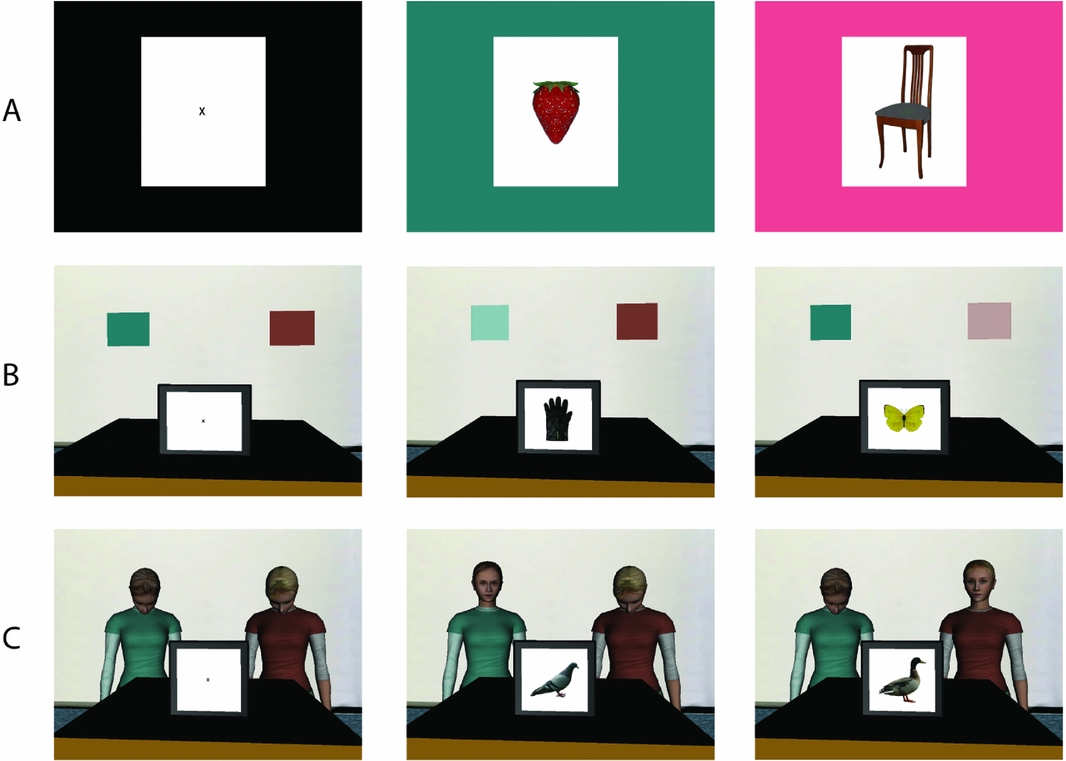 Figure 1 A) In Experiment 1, a standard cued picture naming procedure was used in which the background color of the screen determined the language (L1 or L2) in which participants named a picture. Pictures were preceded by a fixation cross (left panel). Background color of the screen changed at picture onset (middle and right panels). B) In Experiment 2, participants named pictures in L1 and L2 in immersive VR as a function of the color cue that lit up at picture onset, following a fixation cross. C) In Experiments 3 and 4, participants named pictures in L1 and L2 in immersive VR as a function of the virtual agent that looked at them at picture onset. EEG was continuously recorded in Experiment 4.