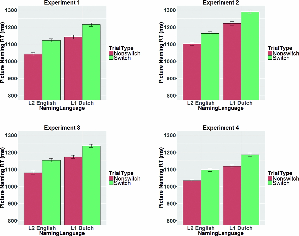 Figure 2 Overview of switch costs in the picture naming RTs in the mixed block for the four experiments. Error bars are standard errors of the mean.