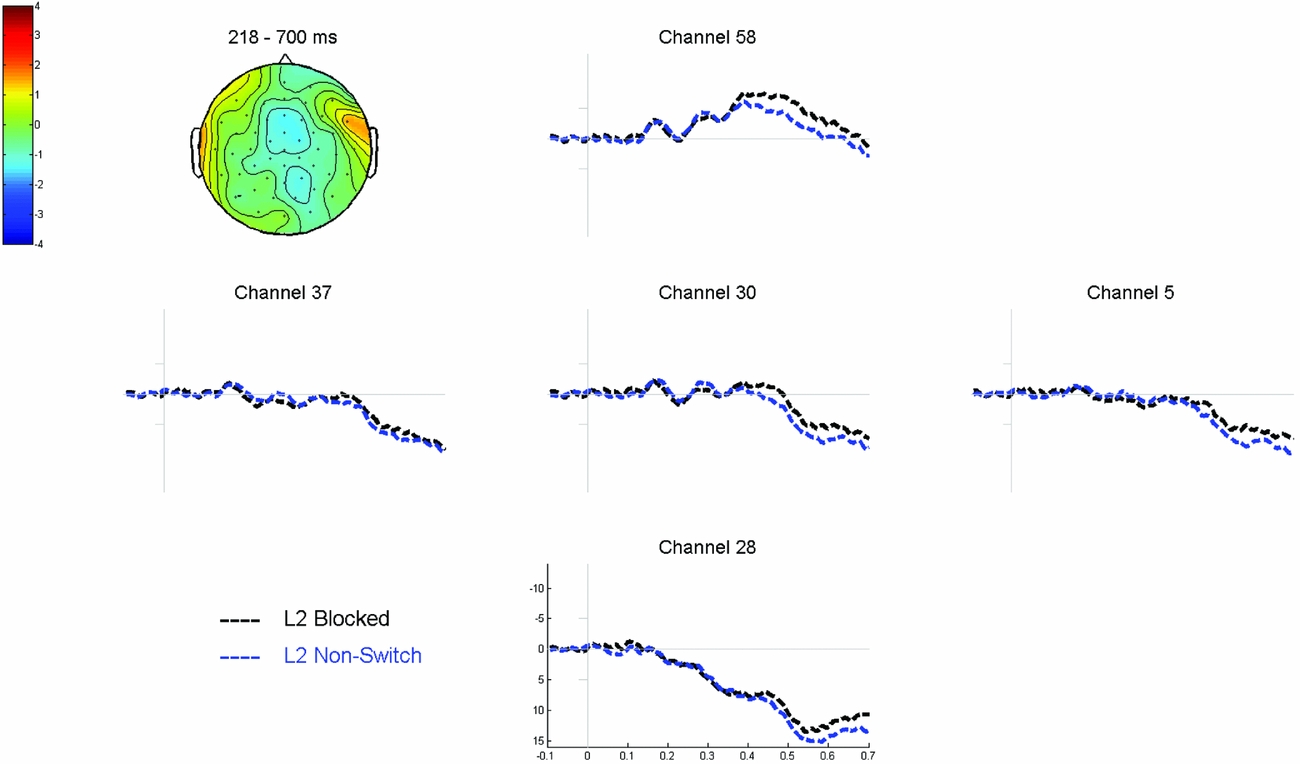 Figure 8 Grand average waveforms time-locked to picture onset comparing L2 blocked to L2 non-switch trials. The topographic plot shows the corresponding voltage difference between the two conditions between 218 and 700 ms after picture onset, for comparison with Figure 7.