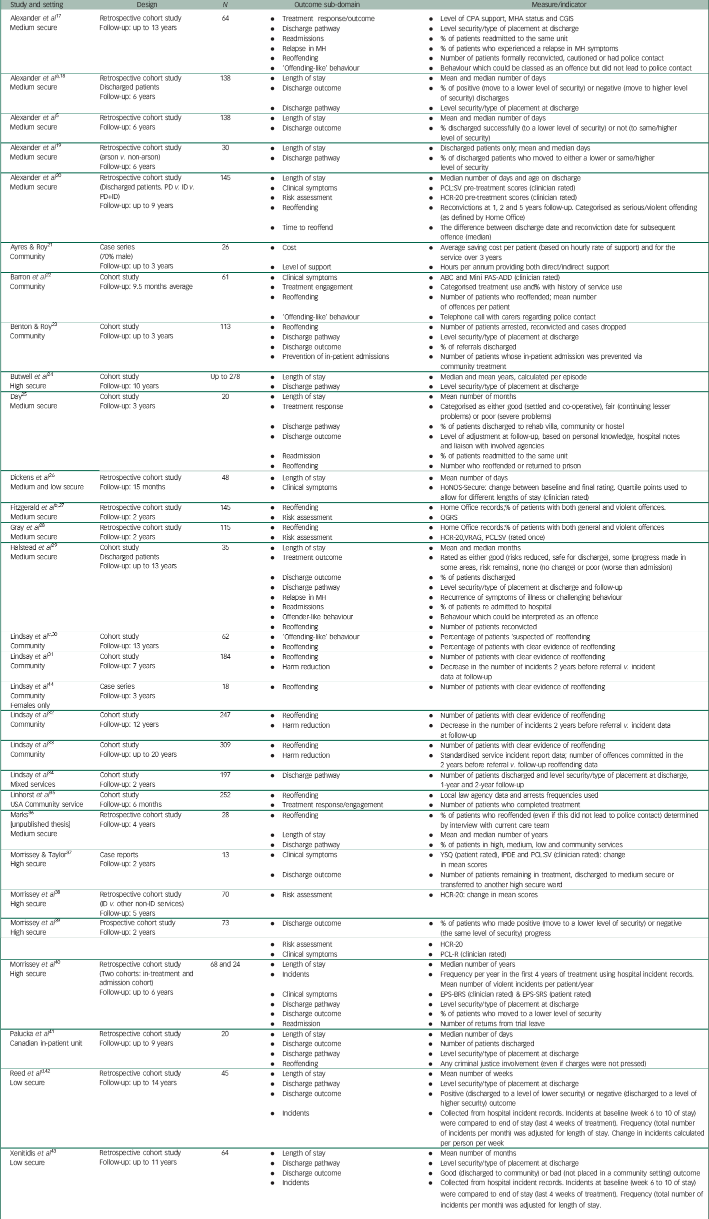 Reoffending and risk were classed as separate sub-domains, with 18 and 12 studies considering variables within these sub-domains, respectively (Tables 1 and 2). Most commonly, studies tended to focus on reoffending using data derived from police or Ministry of Justice records. One study followed up reoffending at 1, 2 and 5 years post-discharge,Reference Linhorst, McCutchen and Bennett 35 whereas another set of studies using the same data-set reported on whether there was reoffending behaviour within the 2 years following discharge from hospital.Reference Douglas, Hart, Webster, Belfrage, Guy and Wilson 78 , Reference Harris, Rice and Camilleri 79 Another, based in Australia, considered arrest data and ‘any criminal justice involvement’ following discharge.Reference Hanson and Thornton 80 A series of studies, based in the community, considered whether treatment within the context of a community-based forensic service led to a reduction in offending behaviours.Reference Benton and Roy 23 , Reference Lindsay, Smith, Law, Quinn, Anderson and Smith 30 – Reference Lindsay, Steptoe, Wallace, Haut and Brewster 33 It is important to note that many people with intellectual disabilities may not be formally dealt with by criminal justice agencies, and as a consequence, ‘formal’ arrest and conviction data may not be a valid index of reoffending. Hence, the category of ‘reoffending-like behaviour’ described in these studiesReference Alexander, Crouch, Halstead, Piachaud, Piachaud and Singh 17 , Reference Barron, Hassiotis and Banes 22 , Reference Halstead, Cahill, Fernando and Isweran 29 , Reference Lindsay, Smith, Law, Quinn, Anderson and Smith 30 is one which is important because it is likely to have increased validity.