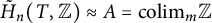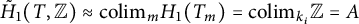$\tilde {H}_1(T,\mathbb {Z})\approx \text {colim}_mH_1(T_m)=\text {colim}_{k_i}\mathbb {Z}=A$