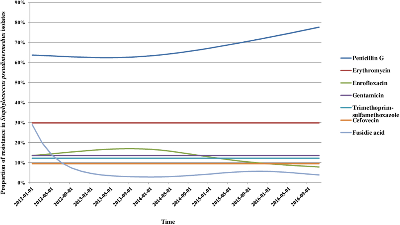 Fig. 1. Trends for antimicrobial resistance in Staphylococcus pseudintermedius isolates from dogs with otitis during the period 2012–2016, on a bimonthly time step.