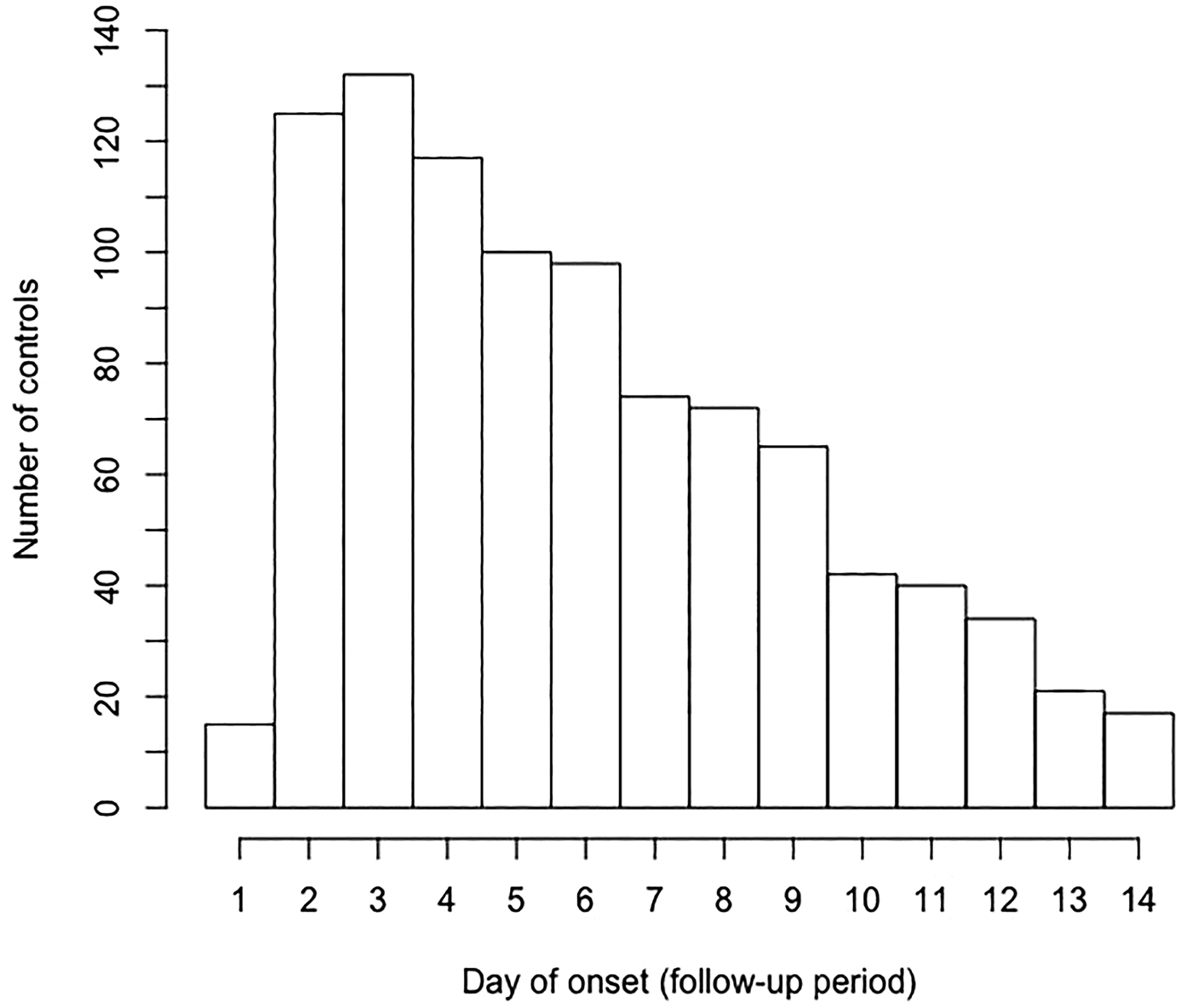 Fig. 1. Date of onset of diarrhoea during 14-day memory aid period among controls with reported diarrhoea.
