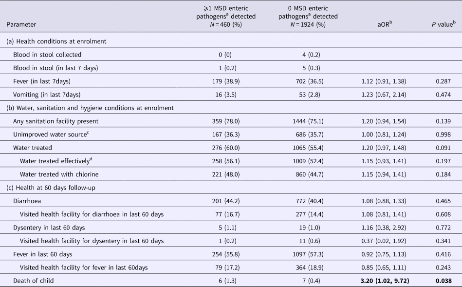 Although few deaths (13) were observed in control children, those with MSD pathogens detected in stool at enrolment were more likely to have died by 60-day follow-up than those without MSD pathogens [6/460 (1.3%) vs. 7/1924 (0.4%), OR 3.2, 95% CI 1.0–9.7, Table 3]. Five of six deaths in control children with MSD pathogens were among those who reported developing diarrhoea (data not shown). No other significant differences were observed between controls with/without MSD pathogens detected. Controls with and without any potential enteric pathogens detected in stool at enrolment did not differ significantly in health or WASH conditions at enrolment, or health at 60-day follow-up (Table S4).