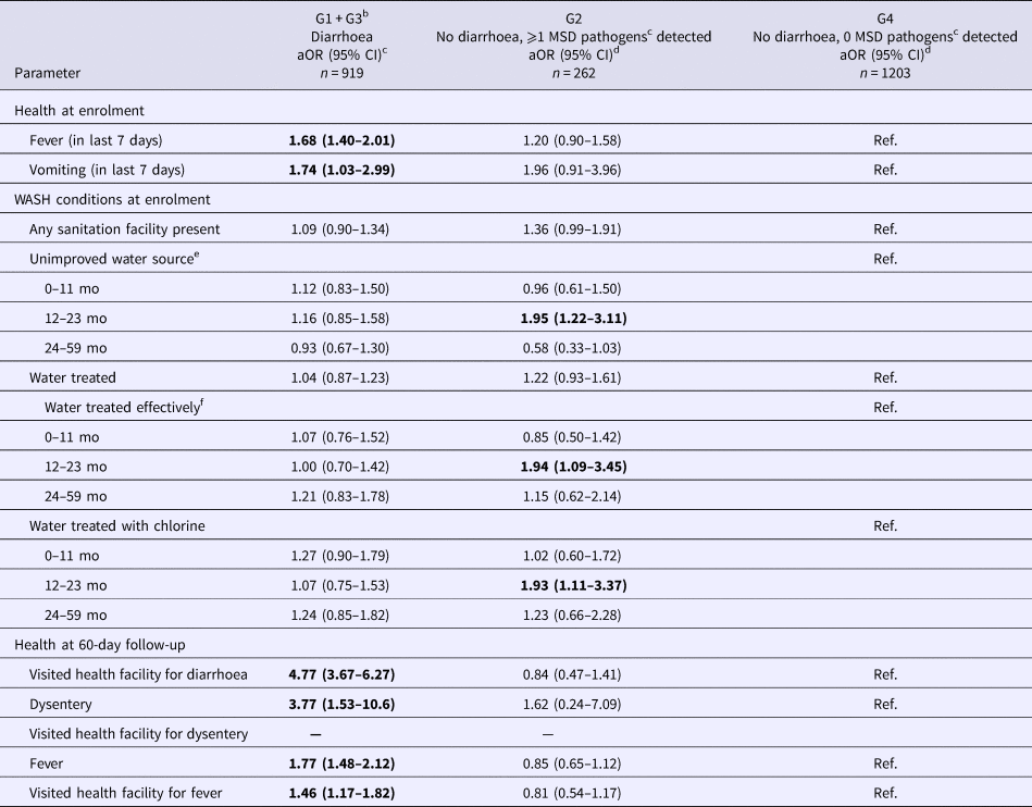 When controls were divided by both reported diarrhoea and MSD pathogen detection, 198 (8.3%) reported diarrhoea and had an MSD pathogen detected (G1), 262 (11%) did not report diarrhoea but had an MSD pathogen detected (G2), 721 (30%) reported diarrhoea but did not have an MSD pathogen detected (G3), and 1203 (51%) did not report diarrhoea or have an MSD pathogen detected (G4, Table S1b). G1 and G3 controls tended to have similar health conditions when measured descriptively (Table S5). Differences in clinical conditions were assessed for combined diarrhoeal controls (G1 + G3 controls), non-diarrhoeal controls with MSD pathogens detected (G2) and non-diarrhoeal controls without MSD pathogens detected (G4, Table 4). G1 + G3 controls had significantly higher odds of having a fever (OR 1.7, 95% CI 1.4–2.0) or vomiting (OR 1.7, 95% CI 1.0–3.0) in the 7 days preceding enrolment compared with G4 controls.