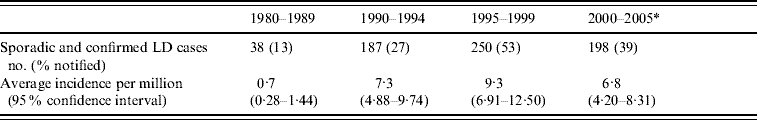 Table 1. Number of sporadic and confirmed cases of Legionnaires' disease (LD) in Denmark, 1980–2005