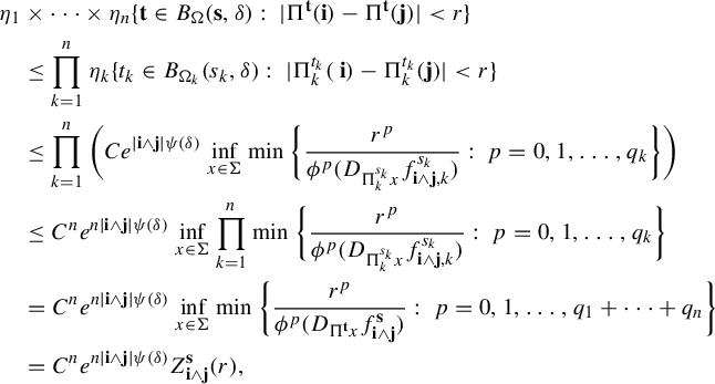 $$ \begin{align*} \eta_1&\times \cdots\times \eta_n\{ \mathbf{t}\in B_{{\Omega}}(\mathbf{s}, \delta): \; |\Pi^{\mathbf{t}}({\textbf{i}})-\Pi^{\mathbf{t}}({\textbf{j}}) |< r\}\\ &\leq \prod_{k=1}^n\eta_k\{t_k\in B_{{\Omega}_k}(s_k, \delta): \; |\Pi^{t_k}_k({\textbf{ i}})-\Pi^{t_k}_k({\textbf{j}}) |< r\}\\ &\leq \prod_{k=1}^n \bigg(C e^{|{\textbf{i}}\wedge {\textbf{j}}| \psi(\delta)} \inf_{x\in \Sigma} \min\bigg\{ \frac{r^p}{\phi^p(D_{\Pi^{s_k}_kx}f_{\mathbf{i}\wedge \mathbf{j}, k}^{s_k})}:\; p=0,1,\ldots, q_k \bigg\}\bigg)\\ & \leq C^n e^{n|{\textbf{i}}\wedge {\textbf{j}}| \psi(\delta)}\inf_{x\in \Sigma}\prod_{k=1}^n \min\bigg\{ \frac{r^p}{\phi^p(D_{\Pi^{s_k}_kx}f_{\mathbf{i}\wedge \mathbf{j}, k}^{s_k})}:\; p=0,1,\ldots, q_k \bigg\}\\ & =C^n e^{n|{\textbf{i}}\wedge {\textbf{j}}| \psi(\delta)}\inf_{x\in \Sigma}\min \bigg\{ \frac{r^p}{\phi^p(D_{\Pi^{\mathbf{t}}x}f_{\mathbf{i}\wedge \mathbf{j}}^{\mathbf{s}})}:\; p=0,1,\ldots, q_1+\cdots+q_n \bigg\}\\ & =C^n e^{n|{\textbf{i}}\wedge {\textbf{j}}| \psi(\delta)}Z_{\mathbf{i}\wedge\mathbf{j}}^{\mathbf{s}}(r), \end{align*} $$