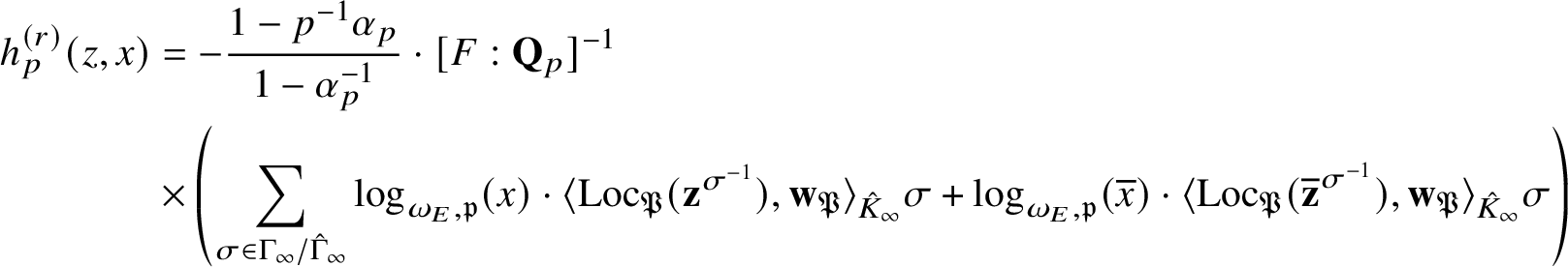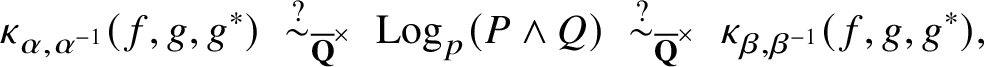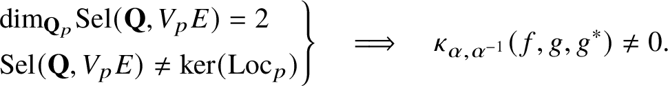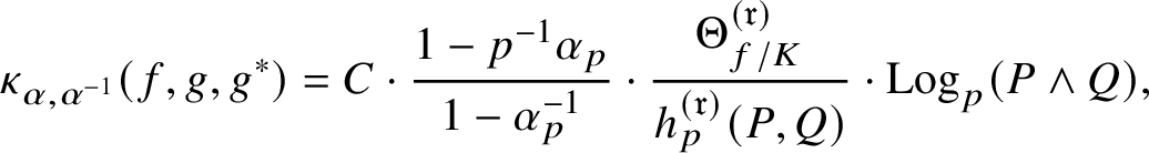 $$ \begin{align*} \kappa_{\alpha,\alpha^{-1}}(f,g,g^{*})=C\cdot \frac{1-p^{-1}\alpha_{p}}{1-\alpha_{p}^{-1}}\cdot\frac{\Theta_{f/K}^{(\mathfrak{r})}}{h_{p}^{(\mathfrak{r})}(P,Q)}\cdot\mathrm{Log}_{p}(P\wedge Q), \end{align*} $$