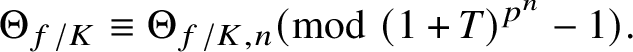 $$ \begin{align*} \Theta_{f/K}&\equiv\Theta_{f/K,n}\pmod{(1+T)^{p^{n}}-1}. \end{align*} $$