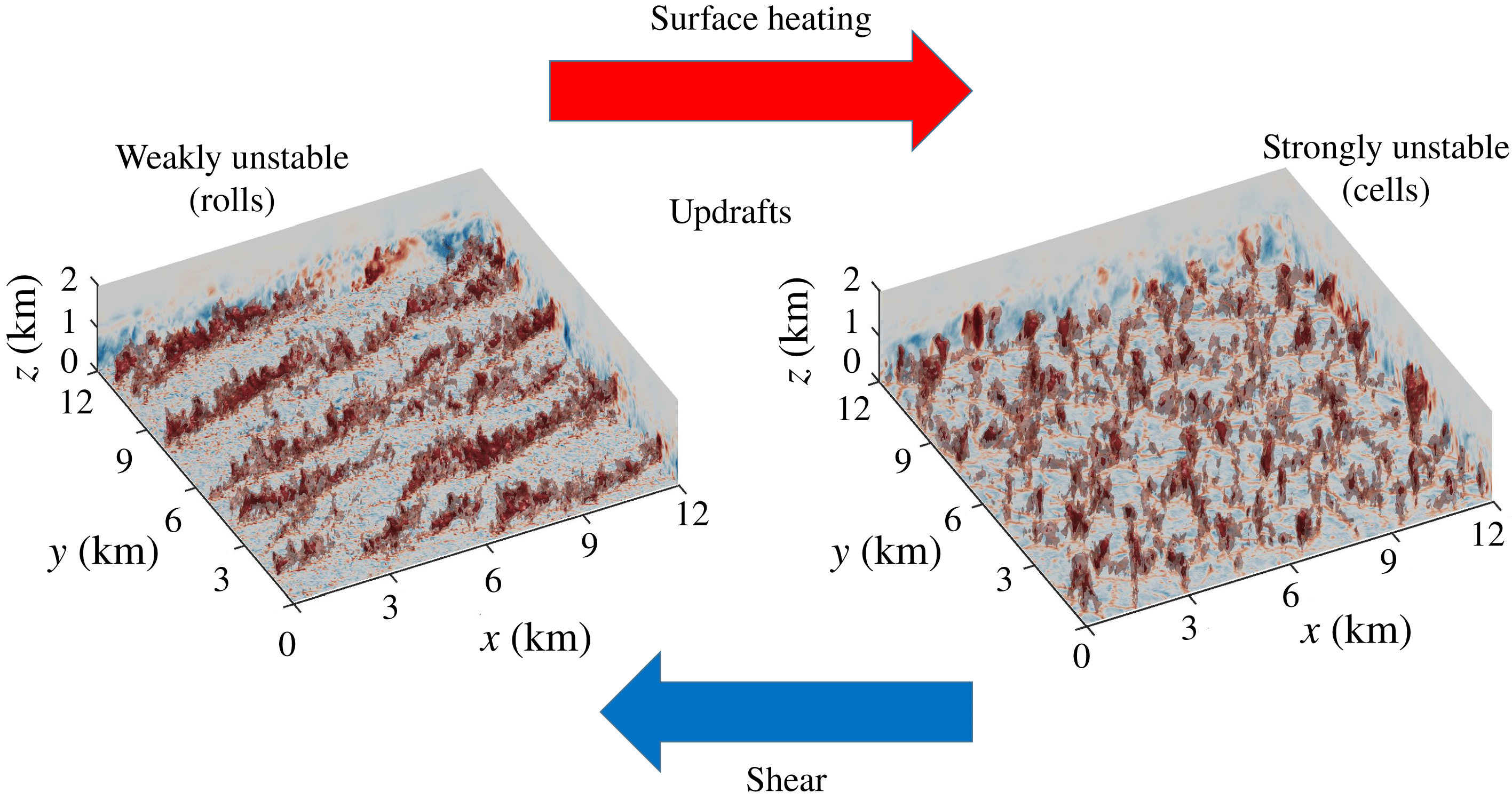 Figure 1. Updrafts (positive vertical velocity) in a mildly heated and strongly heated atmospheric boundary layer.