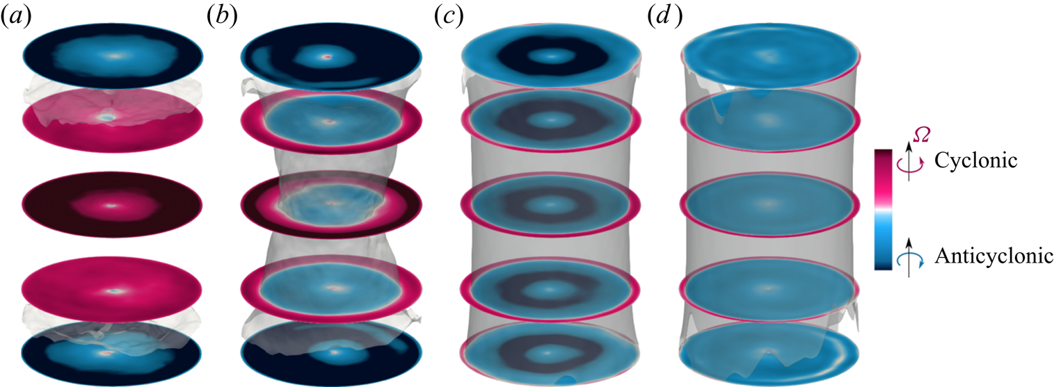 The computational grids are set to be sufficiently fine to resolve the mean Kolmogorov microscales (Shishkina et al. Reference Shishkina, Stevens, Grossmann and Lohse2010) in the bulk and within the BLs (see table 2 in the Appendix). Grid nodes are clustered near the walls to resolve thermal and velocity BLs, resulting in grids that are non-equidistant in both the radial and vertical directions. As rotation increases, the viscous BL gets thinner (Kunnen et al. Reference Kunnen, Clercx, Geurts, van Bokhoven, Akkermans and Verzicco2008; Stevens, Verzicco & Lohse Reference Stevens, Verzicco and Lohse2010; Horn & Shishkina Reference Horn and Shishkina2015) so more points are required near boundaries: we take at least seven points within each BL. The details of all simulated parameters and the corresponding grid resolution are listed in table 2 along with a benchmark comparison between