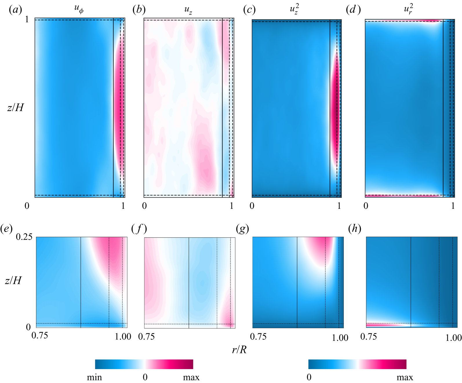 $\sqrt {\langle {u_\phi }^2\rangle _{t, \phi , z}+\langle {u_z}^2\rangle _{t, \phi , z}}\,(r)$ are obtained. The velocity components are all averaged in time and over the surface parallel to the corresponding wall. The same criterion was used previously in studies of the sidewall layers in rotating convection (see Kunnen et al. Reference Kunnen, Stevens, Overkamp, Sun, van Heijst and Clercx2011).