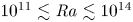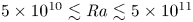 $10^{11} \lesssim {Ra} \lesssim 10^{14}$ in experiments) and