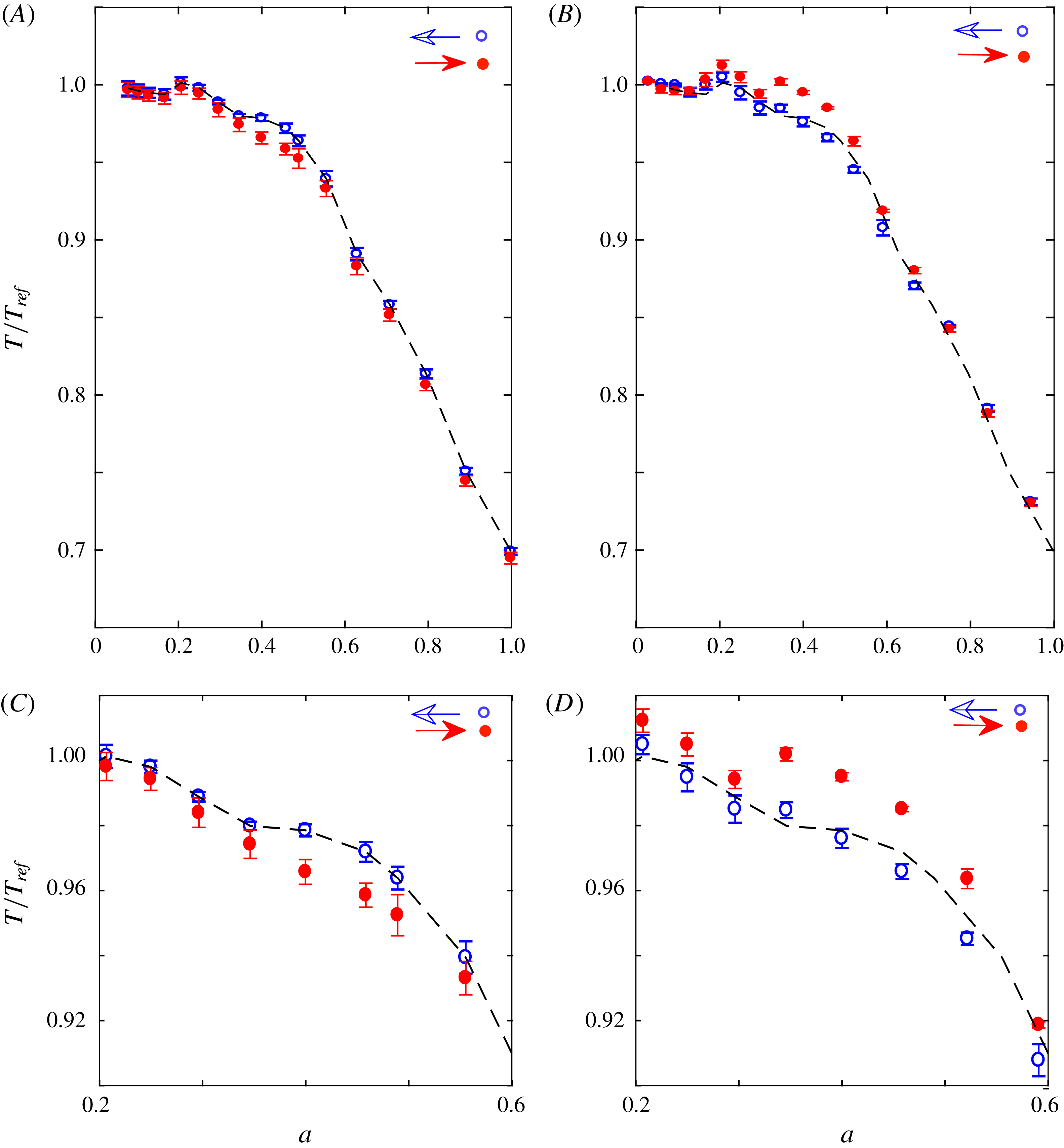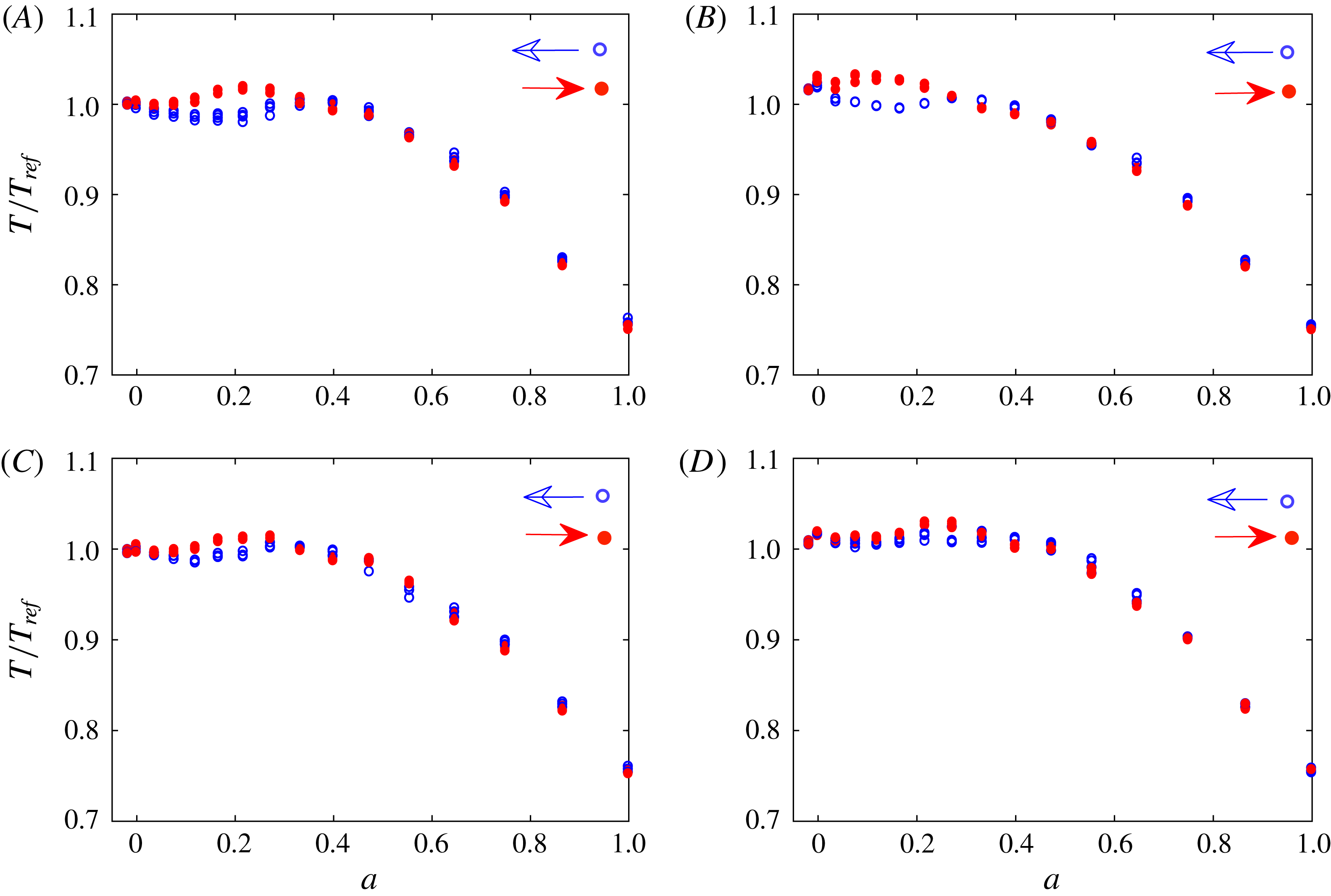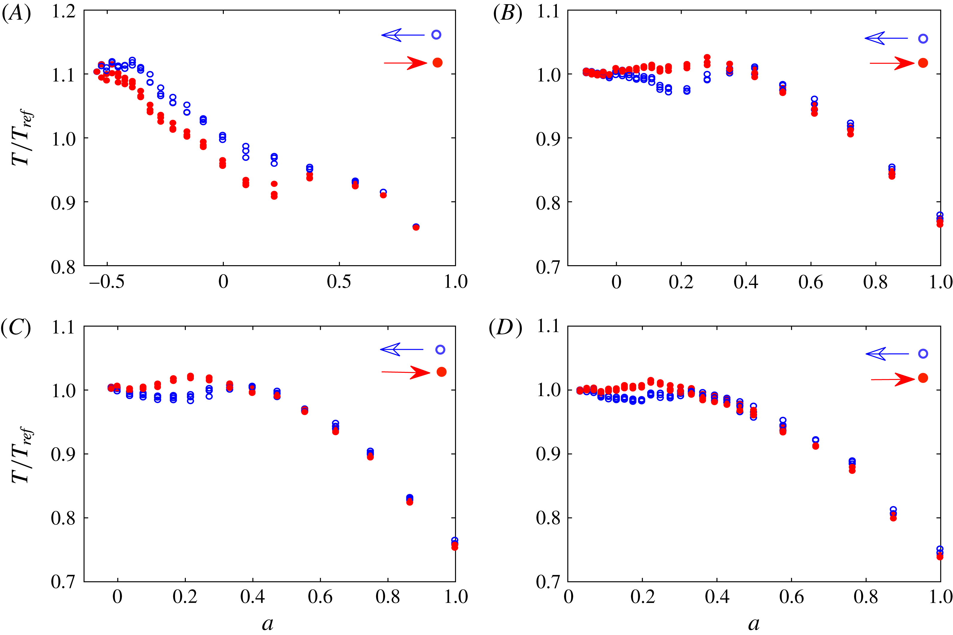 (red) are higher than the values obtained for the opposite trajectory, whereas the reverse is observed for the transition regime. In addition, for the turbulent cases, it can be seen that the hysteresis does not occur around the peak torque values, which was found to be the case in the study of Huisman et al. (Reference Huisman, van der Veen, Sun and Lohse2014) (their figure 3
