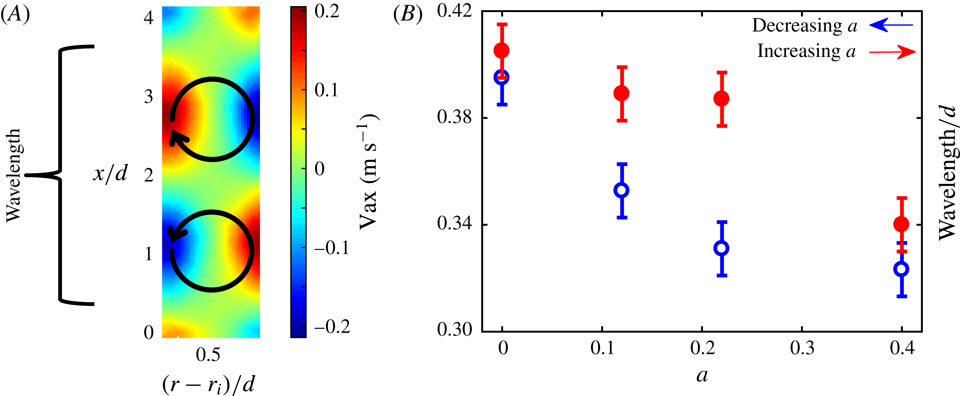 Figure 8. (A) Mean velocity field of the axial velocity component and (B) normalized wavelengths of the patterns together with reading errors. The black arrows schematically illustrate the rolls and flow direction.
