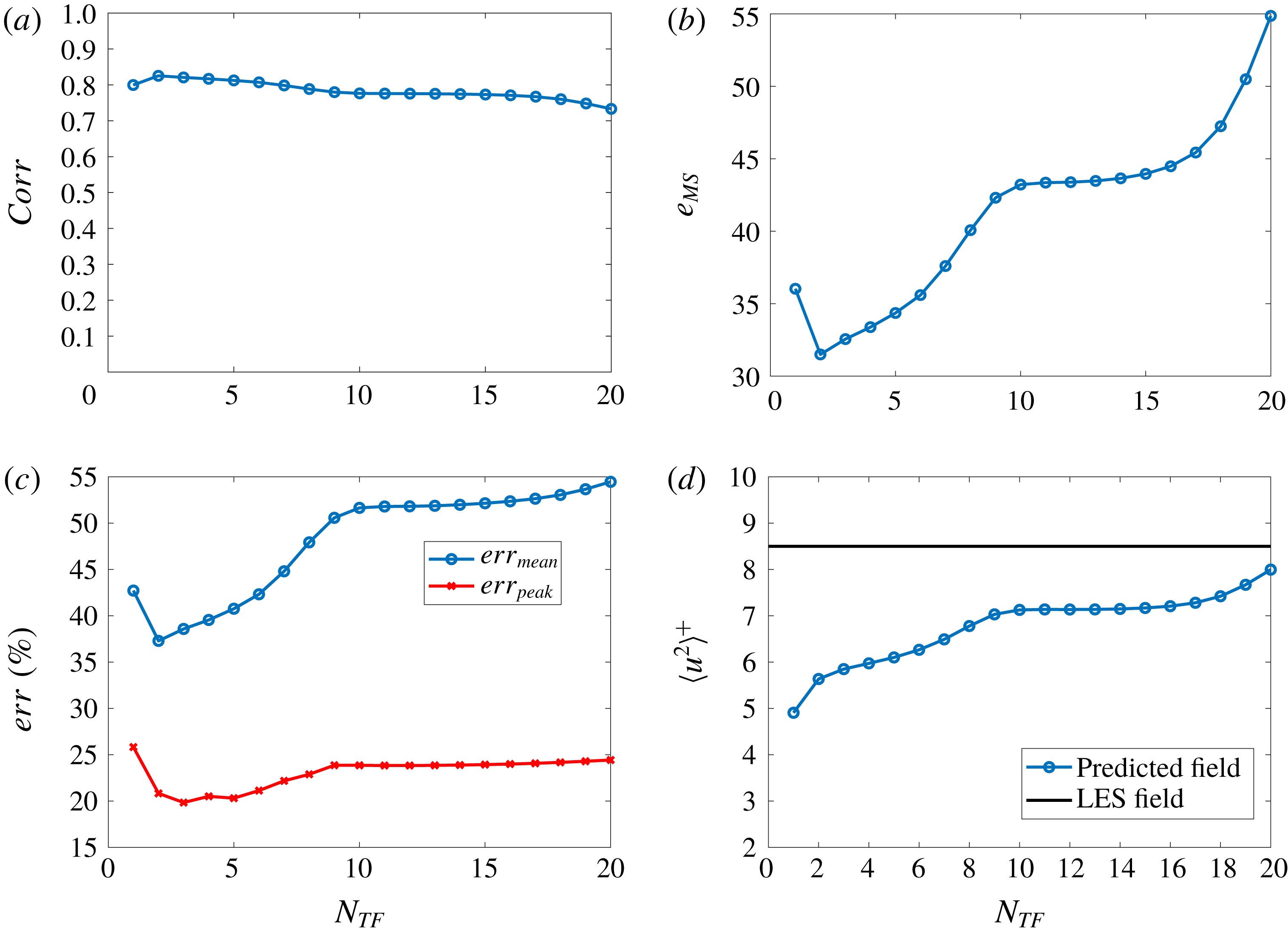 until the wall, when four input measurements were considered. Since this method corresponds to a linear approach, the use of standard linear control techniques may be carried out directly within this framework (Bendat & Piersol Reference Bendat and Piersol2011). This is the most interesting approach for data reconstruction from a limited set of measurements, since it produces velocity fields in compelling agreement with the reference data.