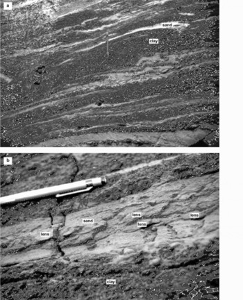 Fig. 11. Glacitectonite at North Head. (a) Lenses and layers of sand within silty clay. Note the various stages of attenuation of in homogeneities into fold noses and allochthonous folds. Pencil for scale. (b) Close-up of lenses within a pinch-and-swell structure of sand. Pencil for scale.