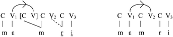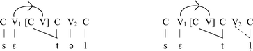 The contrast in (11) in fact provides an additional argument for a CV representation: the restriction concerning short vs. long vowels shown in (11a–b) applies not only in the case of coda–onset clusters, but also before so-called ‘bogus clusters' (e.g. atlas [ˈætləs], but *[ˈeɪtləs],Footnote 12 again well-formed with a pronounced schwa inside the cluster, as in odalisque [ˈəʊdəlɪsk]), where the consonants cannot form either a coda–onset cluster, or a branching onset in any version of Government Phonology, therefore they must be separated by an empty nucleus (e.g. Kaye et al. Reference Kaye, Lowenstamm and Vergnaud1990).Footnote 13 In a standard Government Phonology analysis, the restriction cannot be formulated in a uniform way: long vowels are ruled out in a closed syllable and preceding an empty nucleus. In the CV approach both contexts involve a following empty nucleus, requiring proper government.