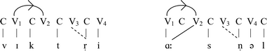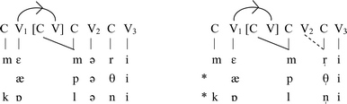 Finally, to preserve the insight that in both (10a) and (10b) the spreading melody is distinctively located only in the head position, C3 and V1, respectively, and it is phonologically unspecified in the dependent position, I employ Harris’ (Reference Harris1994: 167) notion of spreading as interpretation. The line connecting the melody to the dependent position then simply indicates the domain over which that melody should be phonetically interpreted. (Of course, as it happens, in the virtual geminate the melody is not interpreted phonetically in C2. Nevertheless, the domain is phonologically demarcated.) In this analysis, virtual geminates in English are present underlyingly in the same way as long vowels are, and their distribution is captured by the lexical redundancy rules responsible for stress. Thus, (10a–b) show that the superficially similar surface forms in (1i.a) and (1ii.a) in fact have different representations.Footnote 11