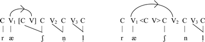 (a) Syllabic consonant: [ˈʃɪbəˌlεθ] (b) Virtual geminate: [ˌræˈkuːn]