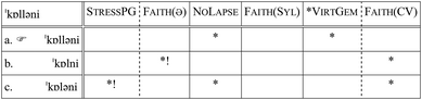 Changing this ranking does not affect the fate of candidates (c) and (d), but candidate (a) is now more harmonic than candidate (b), and by virtue of that it wins. Comparing candidates (a) and (d), this tableau also demonstrates the ranking of StressPG above *VirtGem, resulting in the existence of virtual geminates, also at the word level.Footnote 28 From now on I will only illustrate the ranking causing syncope,