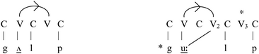 The restriction in (1ii.b, f) above, that is, that superheavy rhymes, involving long vowels in closed syllables, are ruled out as well in English (i.e. examples like *[ˈviːktə] and *[guːlp] are ill-formed) is analysed by Borowsky (Reference Borowsky1989). To account for this, she poses an upper limit on rhymes (at Level 1), restricting them to contain maximally two positions (or moras). In addition, she assumes that final consonants are extrasyllabic. Therefore certain types of ‘superheavy rhymes', like those in (1ii.e) and (1i.f), are well-formed in English, but only word-finally (viz. [hɔːk] (VV$C) and [gʌlp] (VC$C)), because now such rhymes are also bipositional (which, of course, will not help examples like *[guːlp], still being tripositional).