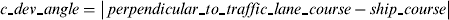$$c\mbox{\_} \hskip1pt dev\mbox{\_} \hskip1pt angle = \left| {\,perpendicular\mbox{\_} \hskip1pt to\mbox{\_} \hskip1pt traffic\mbox{\_} \hskip1pt lane\mbox{\_} \hskip1pt course - ship\mbox{\_} \hskip1pt course} \right|$$• Sections 4.3.4 and 4.3.5. (Traffic lane is cross-transited through on a wrong heading or Traffic lane is transited through on a wrong heading):