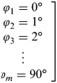 $\hskip-12pt\left[ {\matrix{ {\varphi _1 = 0{\curr { \char "000B0}}} \cr {\varphi _2 = 1{\curr { \char "000B0}}} \cr {\varphi _3 = 2{\curr { \char "000B0}}} \cr {\matrix{ \vdots \cr {\varphi _m = 90{\curr { \char "000B0}}} \cr}} \cr}} \right]$, degree intervals differ depending on how many intervals to m is decided.