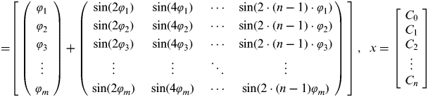 $$\hskip-10pt\left[\!\! {\matrix{ {\left( {\matrix{ {\varphi _1} \cr {\varphi _2} \cr {\varphi _3} \cr {\matrix{ \vdots \cr {\varphi _m} \cr}} \cr}} \right)}\!\!\!\!\! & +\!\!\!\!\! & {\left( {\matrix{ {\sin (2\varphi _1 )} & {\sin (4\varphi _1 )} & \cdots & {\sin (2 \cdot (n - 1) \cdot \varphi _1 )} \cr {\sin (2\varphi _2 )} & {\sin (4\varphi _2 )} & \cdots & {\sin (2 \cdot (n - 1) \cdot \varphi _2 )} \cr {\sin (2\varphi _3 )} & {\sin (4\varphi _3 )} & \cdots & {\sin (2 \cdot (n - 1) \cdot \varphi _3 )} \cr {\matrix{ \vdots \cr {\sin (2\varphi _m )} \cr}} & {\matrix{ \vdots \cr {\sin (4\varphi _m )} \cr}} & {\matrix{ \ddots \cr \cdots \cr}} & {\matrix{ \vdots \cr {\sin (2 \cdot (n - 1)\varphi _m )} \cr}} \cr}} \right)}\!\! \cr}} \right]\! \cdot\! \left[\! {\matrix{ {C_0} \cr {C_1} \cr {C_2} \cr {\matrix{ \vdots \cr {C_n} \cr}} \cr}} \!\right]\! =\! \left[\! {\matrix{ {S(\varphi _1 )} \cr {S(\varphi _2 )} \cr {S(\varphi _3 )} \cr {\matrix{ \vdots \cr {S(\varphi _m )} \cr}} \cr}} \!\right]$$where,