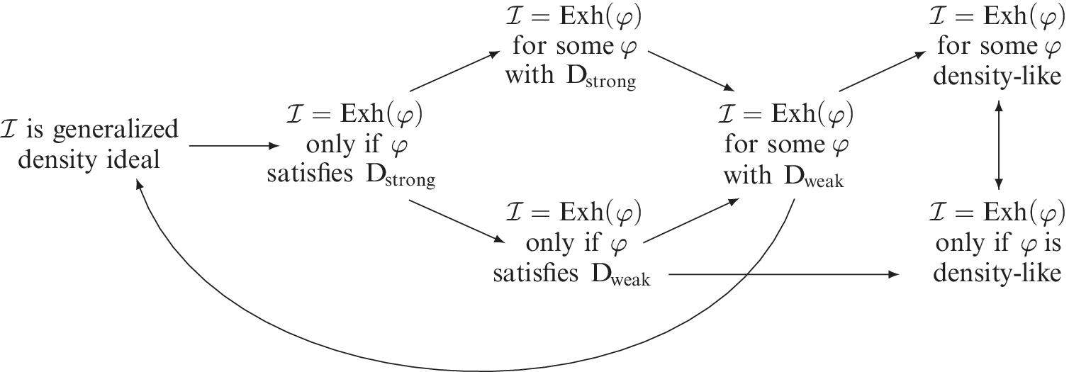 Figure 1 Relationship between generalized density ideals and density-like ideals, assuming $\mathcal {I}$ is an analytic P-ideal.