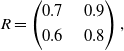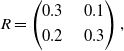 \begin{equation}R=\begin{pmatrix}0.3 & \quad 0.1 \\[3pt] 0.2 & \quad 0.3\end{pmatrix},\end{equation}