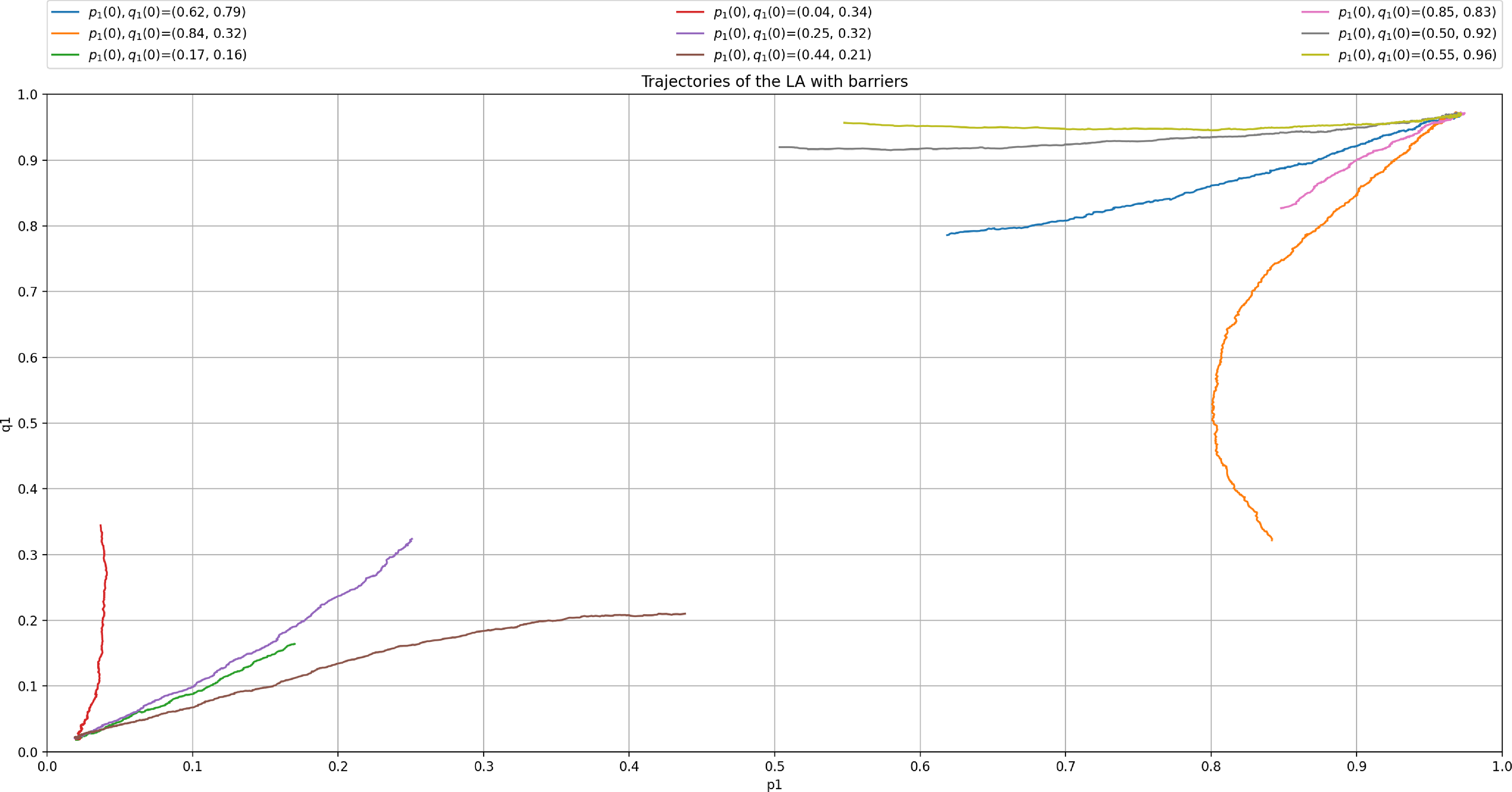 Figure 10. 9 Trajectories of the LA with barriers starting from random initial point with