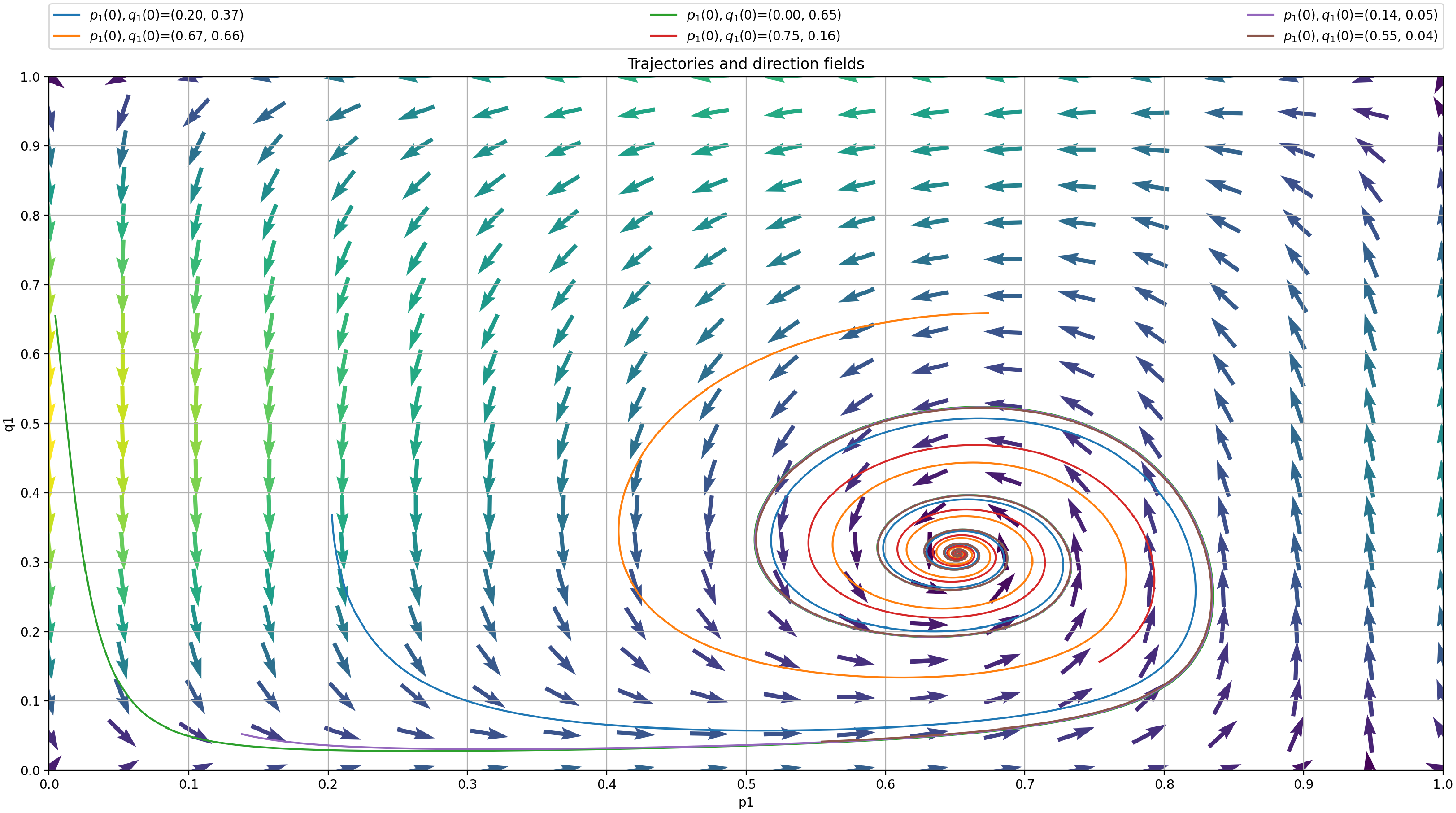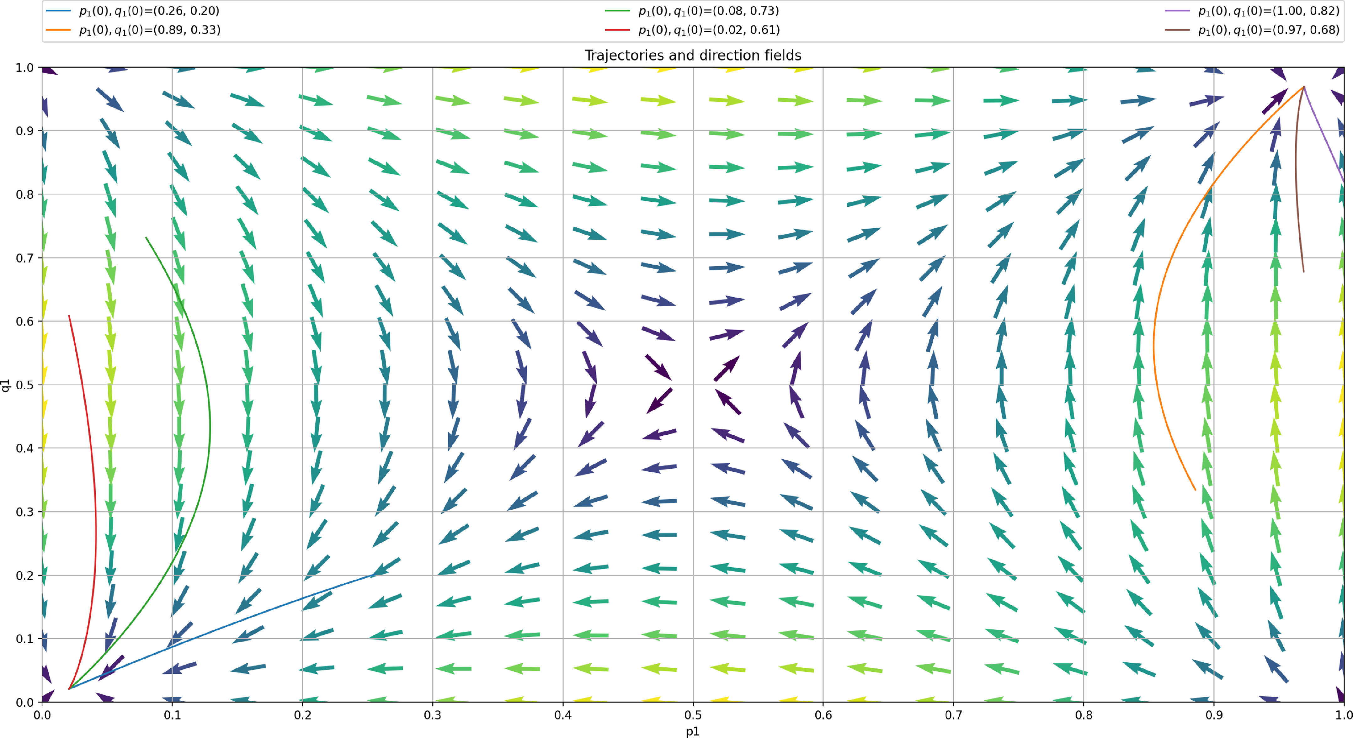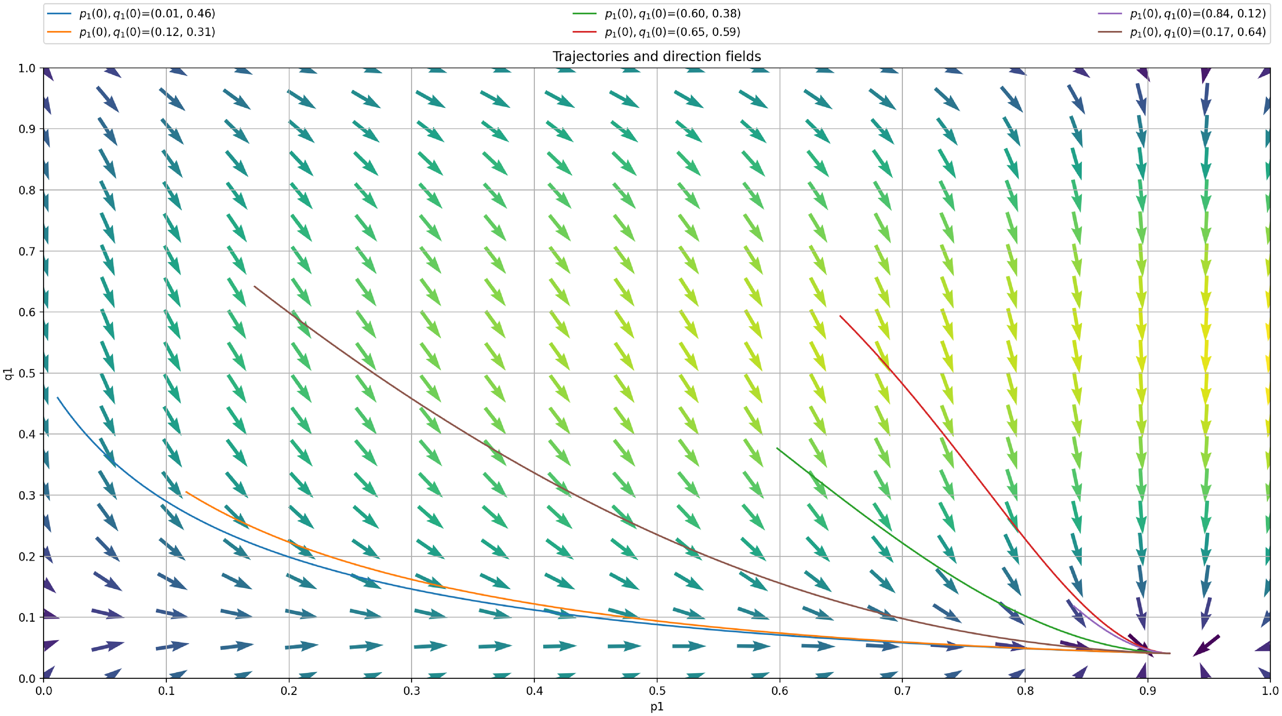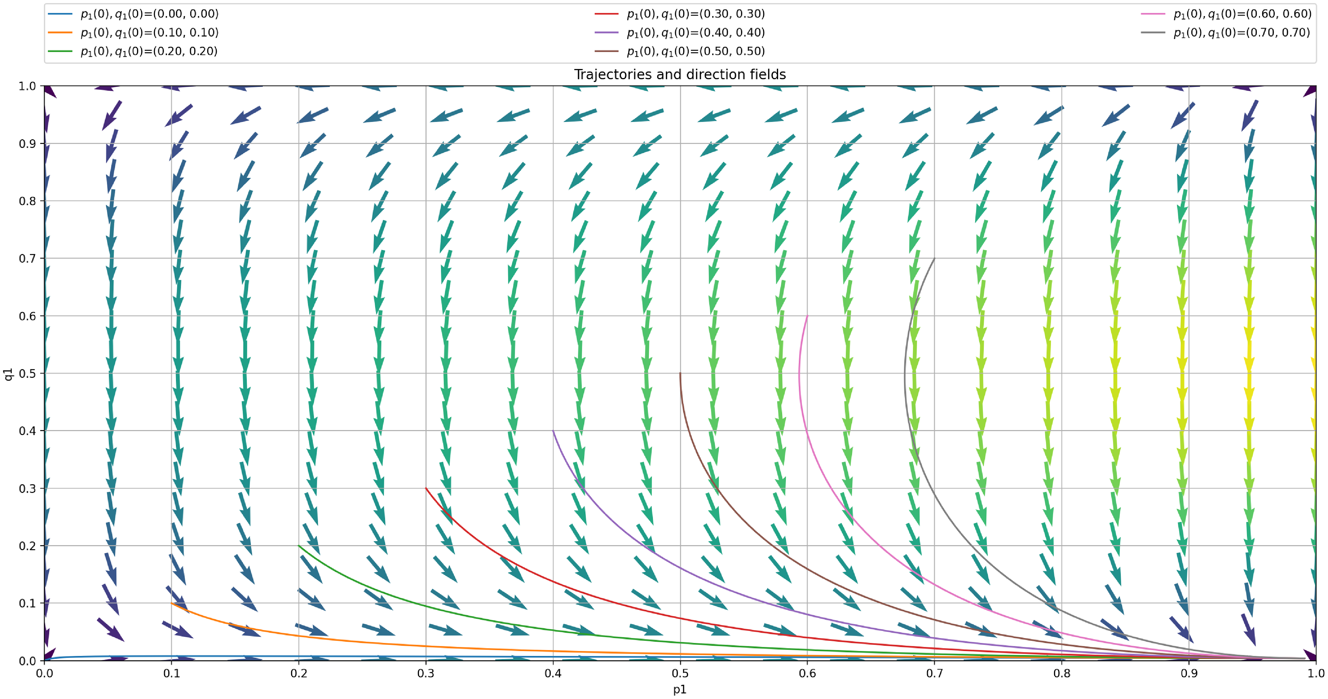We plot the ODE corresponding to our LA for case 3 in Figure 11. We can see two attractions points which approach the two Nash equilibria.
