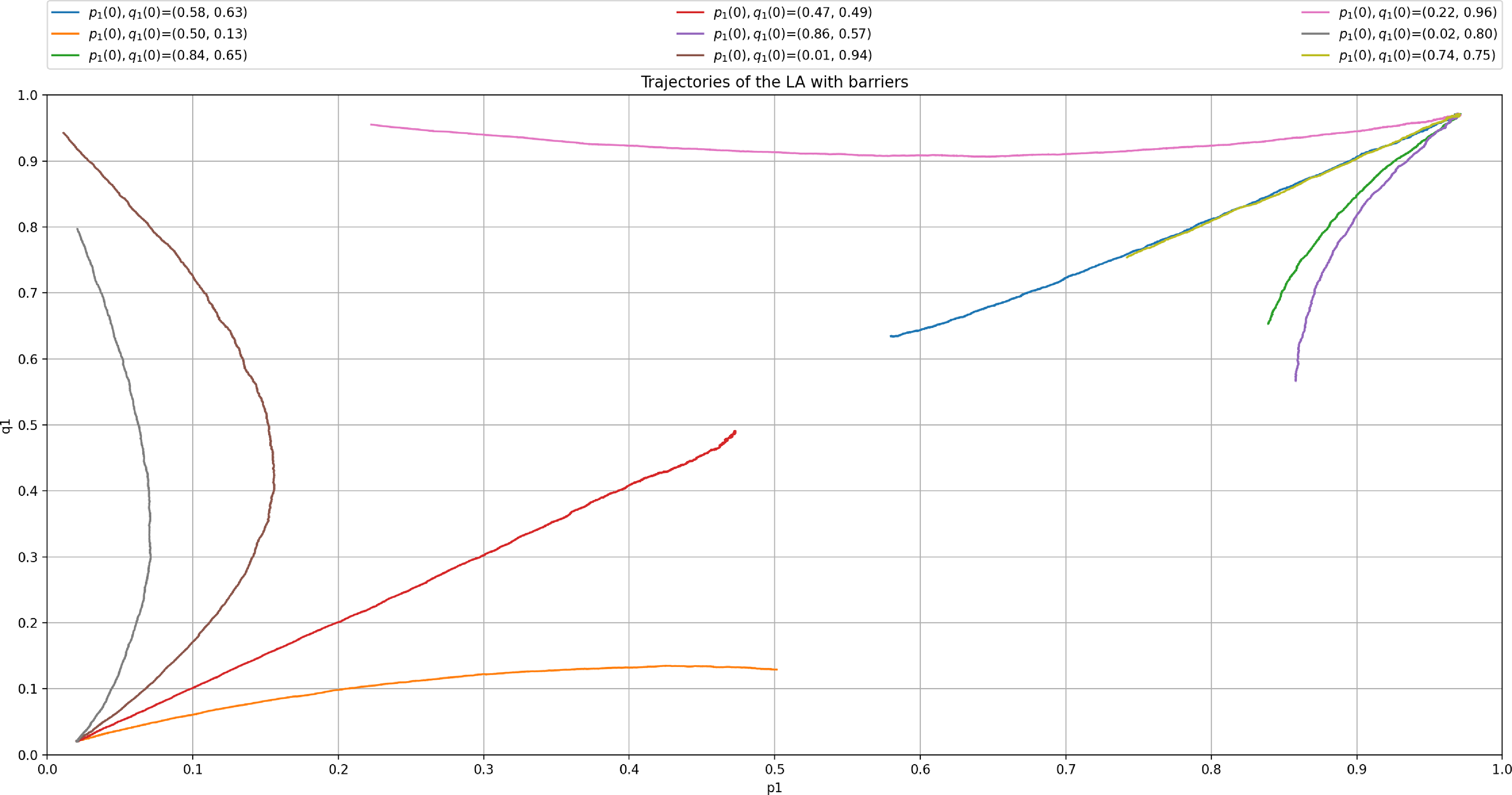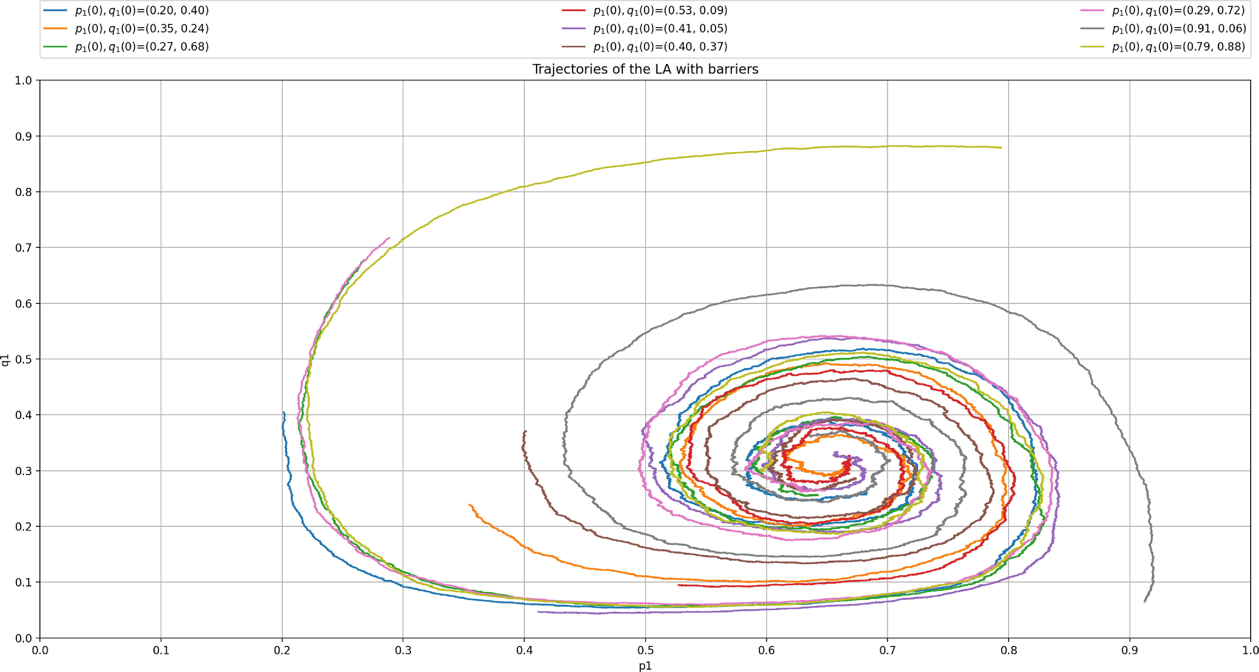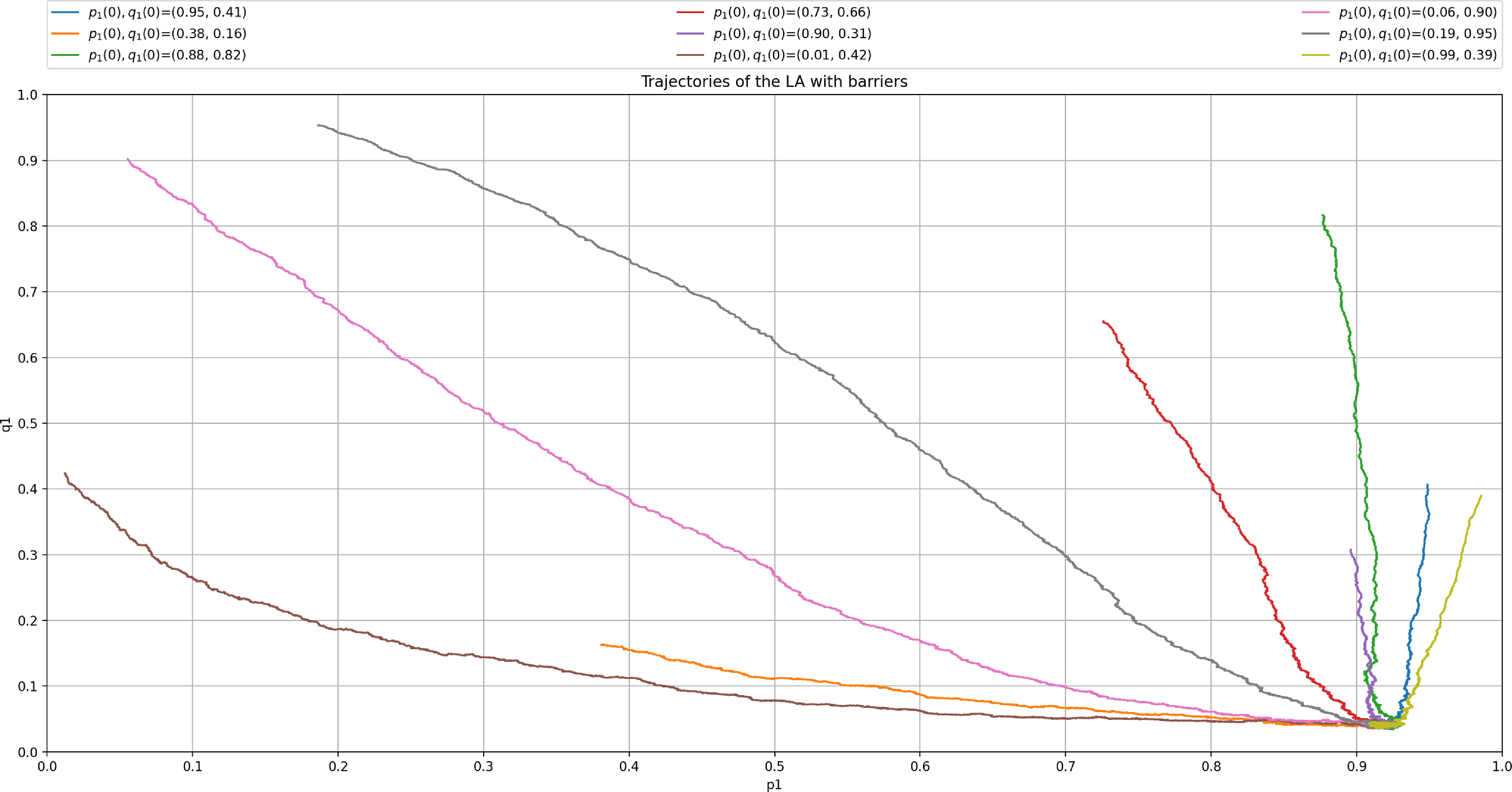 In Figure 10, we plot 9 trajectories for the LA for a number of iterations is 1 000 000. We observe that depending on the initial conditions, our LA converges to one of the two pure equilibria which is usually the closest to the starting point. We have also performed extensive simulations with initial values