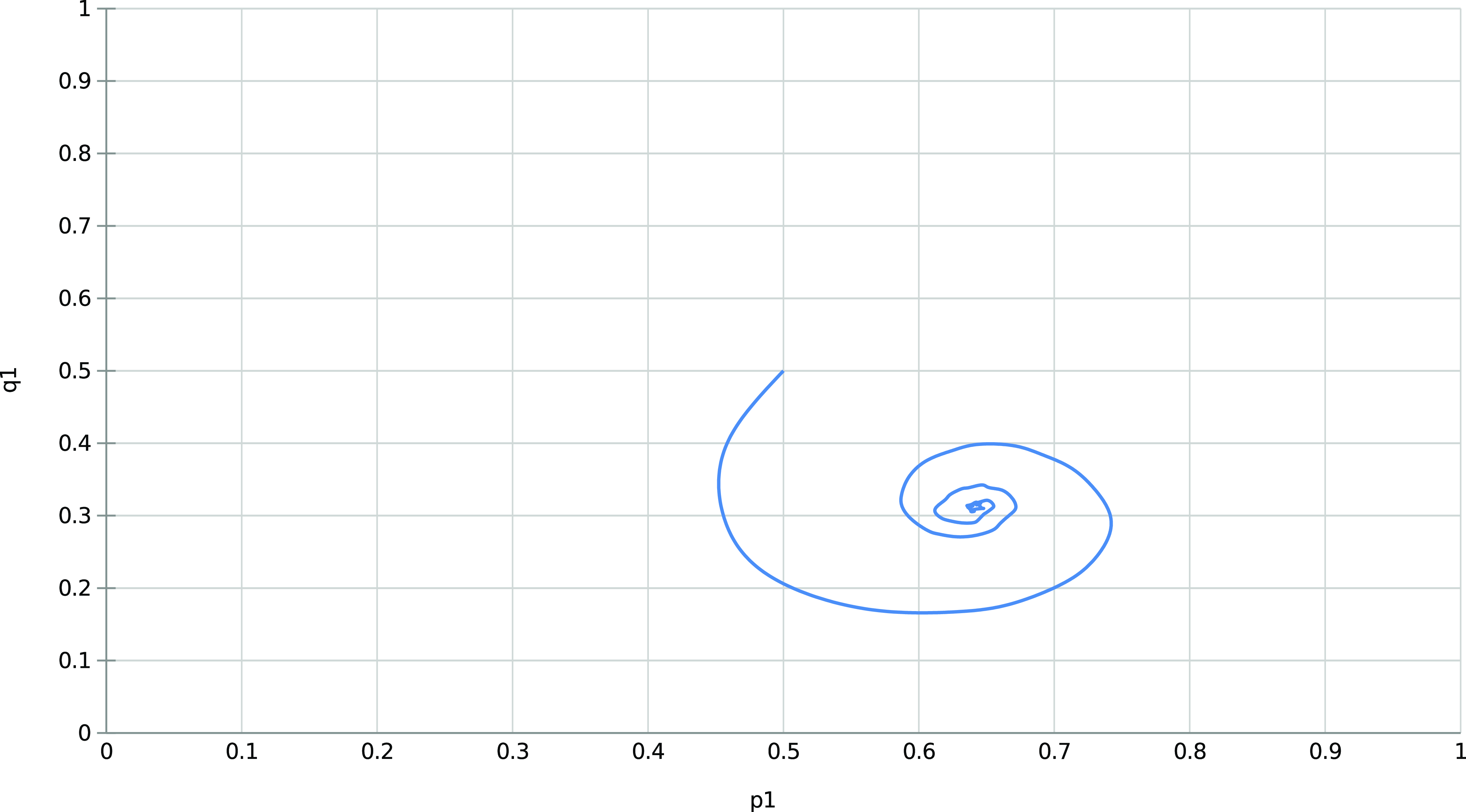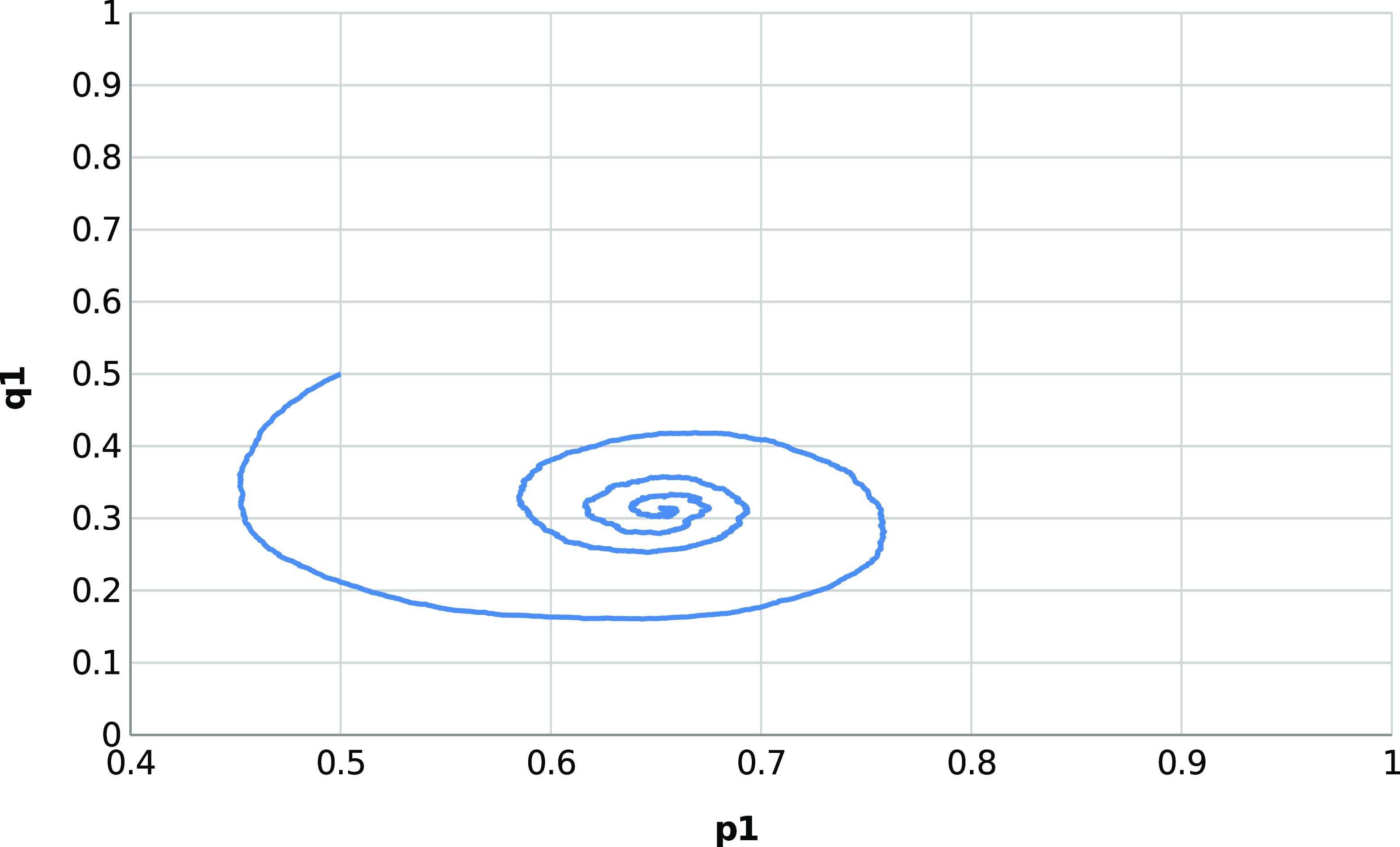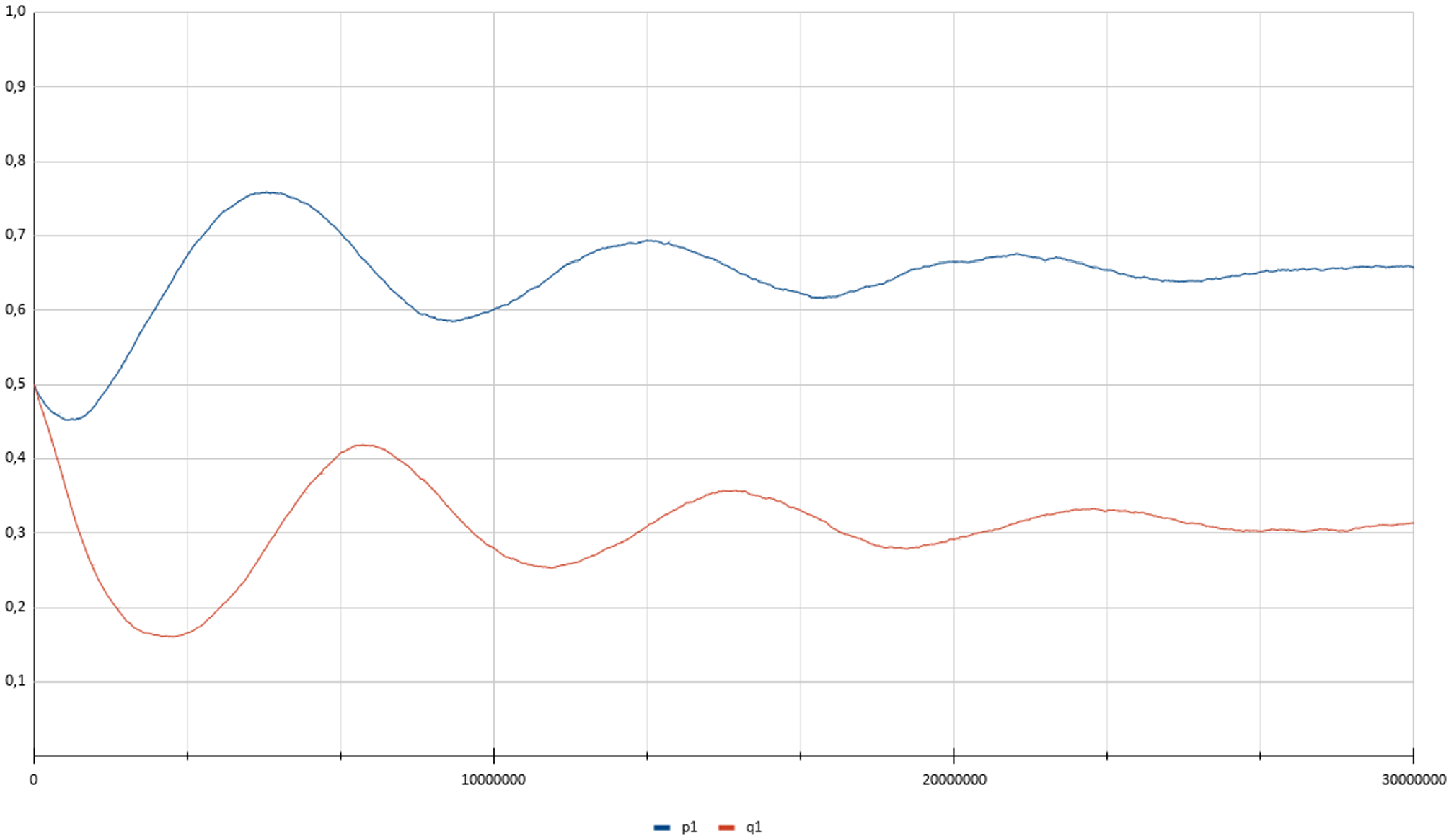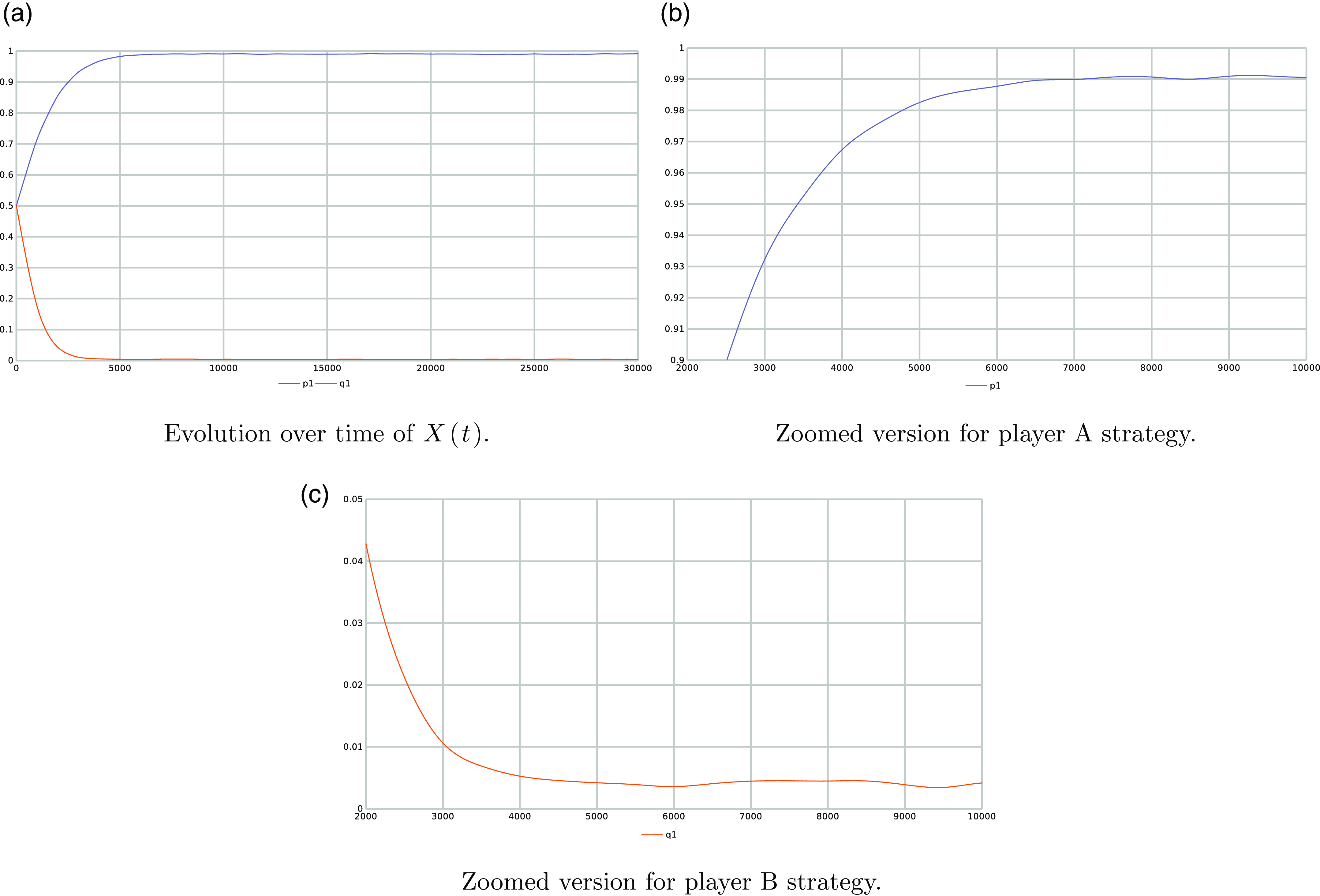 We also examined the case where the game has a single pure equilibrium. The exhibited behavior is comparable to those reported in Section 6. The trajectory of the LA depicted in Figure 13 tightly follows the trajectories of the ODE depicted in Figure 6. As