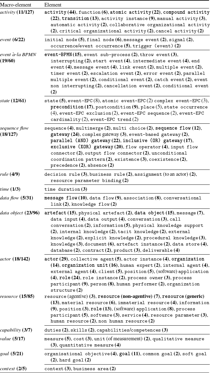 Focusing on the frequency of the elements in the meta-models, 20 elements appear in at least 15% of them and are: activity, atomic activity, compound activity, transition, event-BPMN, precondition, sequence flow, gateway, parallel (AND) gateway, inclusive (OR) gateway, exclusive (XOR) gateway, message flow, artefact, data object, actor, organisation, organization unit, role (both as an actor and as a resource), resource (generic) and goal. If we increase the threshold to ‘appearing in at least 25% meta-models’, then only 11 elements satisfy it: activity, atomic activity, compound activity, precondition, gateway, parallel (AND) gateway, inclusive (OR) gateway, exclusive (XOR) gateway, actor, organization unit and role as an actor(/organisation). A remark needs to be made here about the element resource=. Indeed if we consider it at a very abstract level, ignoring its agentive vs non agentive characterization, then it also appears in at least 15% and 25% of meta-models. Similarly, it happens for ‘event’ when considering together event-BPMN and event-EPC. Finally, only one element (activity) appears in more than 50% of the studies.