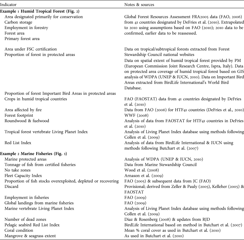 To explore the practicality of the linked indicators approach we applied it to two systems: humid tropical forests and marine fisheries. We looked for data and indicators that are currently available to populate the framework, recognizing that the majority of these require further development and enhancement. In some cases the indicators we use are surrogates for more directly relevant, but currently unavailable, measures, or are regional examples for which global data are not yet available.
