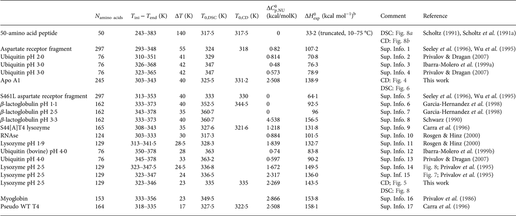 High quality DSC data of lysozyme (Privalov et al. Reference Privalov, Kavina, Freire and Privalov1995; Rosgen & Hinz, Reference Rosgen and Hinz2000), RNAse (Rosgen & Hinz, Reference Rosgen and Hinz2000), ubiquitin (Privalov & Dragan, Reference Privalov and Dragan2007), myoglobulin (Privalov & Makhatadze, Reference Privalov and Makhatadze1993) and β-lactoglobulin (Schwarz, Reference Schwarz1990) were also analysed, even though no CD spectra were available.