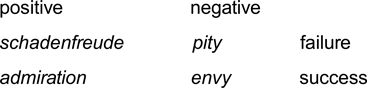 How then can an emotion have an opposite? Emotions can be opposites if they differ in the positive–negative component of the same kind of thing, or if they have the same positive–negative attitude to things that are opposite, or if they differ in both.Footnote 3 Spelling out opposites can be useful. For instance, by determining the opposites of schadenfreude, which has no English equivalent, we can readily see how this borrowed word fills a gap in our emotional vocabulary. Schadenfreude is the positive/agreeable reaction to someone's misfortune or failure, and thus it is the opposite of pity, the negative/disagreeable reaction to someone's misfortune or failure. Similarly, admiration and envy are opposites: admiration is the positive/agreeable reaction to someone's success or achievement, and envy the negative/disagreeable reaction to someone's success or achievement. It follows then that schadenfreude and envy are opposite in both components, as are admiration and pity; and that schadenfreude is opposite to admiration in one component and to pity in another. In respect of their contrasts, these four emotions form a set. A simple table may help to make clear exactly where schadenfreude belongs: