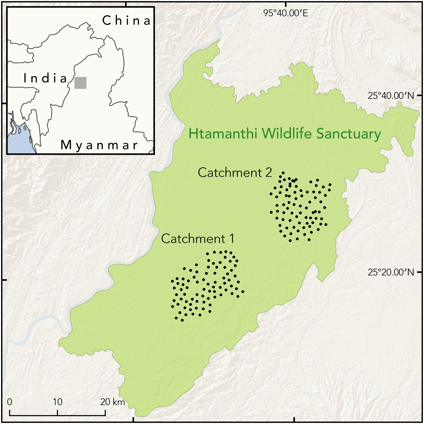 As part of a range-wide camera-trapping study of the clouded leopard and members of its guild we deployed camera traps in two catchments within the Htamanthi Wildlife Sanctuary over 2 consecutive years. Htamanthi Wildlife Sanctuary is the southernmost Key Biodiversity Area of the Northern Forest Complex (also Tiger Conservation Landscape 37, GTRP, 2010).