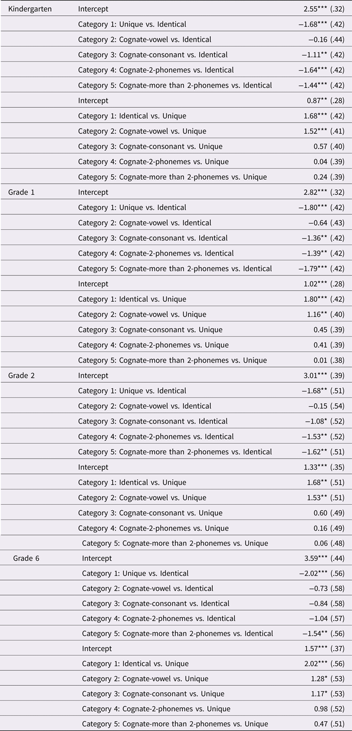 As can be seen from Table 3, within the group of kindergarteners, identical words were easier to judge than unique words (b = –1.68, p < .001), and they were easier than all other types of cognates, except 1-vowel distant cognates (category 2) (b = –1.11, p < .01, b = −1.64, p < .001, b = –1.44, p < .001). At the same time, 1-vowel distant cognates were easier than unique words (b = 1.52, p < .001), but no other significant differences were found between unique words and the other word categories. The same pattern was replicated among first- and second-graders, but it changed among sixth-graders. Within the sixth-grade group, cognates distant by one phoneme (vowel or consonant) and by two phonemes yielded similar accuracy scores to identical words (category 2, 3, 4). However, unique words and more than 2-phoneme distant cognates were significantly more difficult than identical words (b = –2.02, p < .001; b = –1.54, p < .01, respectively). At the same time, only 1-phoneme distant cognates (1 vowel or 1 consonant) were significantly easier than unique words (b = 1.17, p < .05). The rest of the cognates were not significantly different from unique words even in this group of sixth-graders.