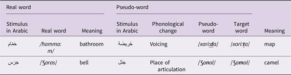 A total of 108 words were selected that belonged to one of the three following word categories: (1) identical words (N items = 18, e.g., SpA-StA /bațți:x/ ‘watermelon’; (2) unique StA words (N items = 18, e.g., StA /miծallah/ ‘umbrella’; and (3) cognate words (N items = 72). Cognate words were classified into four subclasses that varied in degree of phonological distance/overlap between their SpA and StA forms (N items = 18 per category): (a) 1-phoneme distant cognates; within this category, words were further divided into two types: 1-vowel distant cognates (e.g., StA /fuțu:r/; SpA /fțu:r/ ‘breakfast’; vowel deletion) and 1-consonant distant cognates (e.g., StA /qalam/; SpA /Ɂalam/ ‘pen’; consonant substitution); (b) 2-phoneme distant cognates: a vowel and a consonant (e.g., StA /miqlama/, SpA /miɁlami/ ‘pencil bag’; (d) more than 2-phoneme distant cognates (e.g., StA /ța:Ɂira/; SpA /țayya:ra/ ‘airplane’). Modelled after similar methodological procedures (Brenders, Hell, & Dijkstra, Reference Brenders, Hell and Dijkstra2011; Cristoffaninia, Kirsnera, & Milecha, Reference Cristoffaninia, Kirsnera and Milecha1986), half of the stimuli were used in their intact form (N items = 54) while the second half were subjected to a phoneme substitution procedure yielding a pseudo-word (N items = 54). Four criteria were considered in selecting the location of the phonological substitution procedure and the phonological profile of the two phonemes to be exchanged: (a) the target phoneme to be replaced was not a phonological distance parameter in the word, and therefore replacing it by another phoneme did not alter the phonological distance of the StA word from its SpA form. For instance, if the StA word varied from its SpA form in one consonant (e.g., StA /mu ծi:ʕ/; SpA /mu zi:ʕ/ ‘newscaster’), consonant substitution could not apply to the variable consonant /ծ/ but to another consonant within the word; (b) the target phoneme to be replaced was a consonant, not a vowel; (c) the target phoneme to be replaced was a medial consonant; not the initial nor the final; and (d) the phoneme which would replace the target original phoneme was also a consonant and was different from the original phoneme in only one feature of articulation: voicing, place of articulation, or manner of articulation. It is important to point out that the nouns selected for the study were not deverbal nouns (not derived by a root), so affiliation of the consonant with the root morpheme of the word was not relevant for the phoneme substitution procedure. It is also important to add that, whereas words in the first two categories of cognates (1- and 2-phoneme distant cognates) involved paradigmatic phonological differences between SpA and StA (e.g., vowel insertion, vowel change, consonant substitution, word-final glottal stop deletion, word-initial glottal stop deletion, etc.), words in the third category (more than 2-phoneme distant cognates) involved mainly words that depicted word-specific phonological differences. Because all words targeted in the study were within the receptive vocabulary of children, and because the phoneme substitution procedure did not alter the phonological distance of the StA word from its SpA form, these words too were deemed appropriate for inclusion in this study. All pseudo-words that resulted from the phoneme substitution procedure were pronounceable strings of sound that abided by the phonotactics of StA. See ‘Appendix’ for examples of items.