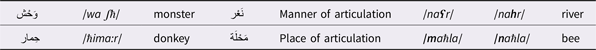 Applying the same three-way classification delineated above to the lexical domain, a recent study analyzed a corpus of 4,408 word types derived from a total of 17,499 word tokens collected from five-year-old speakers of Palestinian Arabic in Central Israel (Saiegh-Haddad & Spolsky, Reference Saiegh-Haddad, Spolsky, Saiegh-Haddad and Joshi2014). This analysis revealed the following distribution of lexical items: (a) identical words, words that have an identical phonological form in SpA and StA (e.g., /na:m/ ‘sleep’, /janu:b/ ‘south’, or /daftar/ ‘notebook’), made up 21.2% of the word types in the children's lexicon – note that StA case and mood inflections were not regarded in this analysis; (b) cognate words, words that are phonologically related yet show only partially overlapping phonological forms when used in each of the two varieties (e.g., SpA /dahab /versus StA /ðahab/ ‘gold’; SpA /sama/ versus StA /sama:Ɂ/ ‘sky’), made up another 40.6%; and (c) unique SpA words, words that have a unique form in SpA that is completely different from the one used in StA (e.g., SpA /juzda:n/ versus StA /ħaqi:bah/ ‘bag’; SpA /ħaṭ/ versus StA /waḍaʕ/ ‘he put’), made up 38.2% of the total number of word types in the children's lexicon. This study also showed that the majority of cognate words (~42%) depicted one phonological distance parameter between their form in SpA and StA, such as consonant substitution, glottal stop deletion, vowel change, and vowel insertion. This was followed by cognates depicting two phonological distance parameters (~24%) and three phonological distance parameters (~11%), with all other word types depicting more than three phonological distance parameters each making up less than 5% of the total number of cognates.